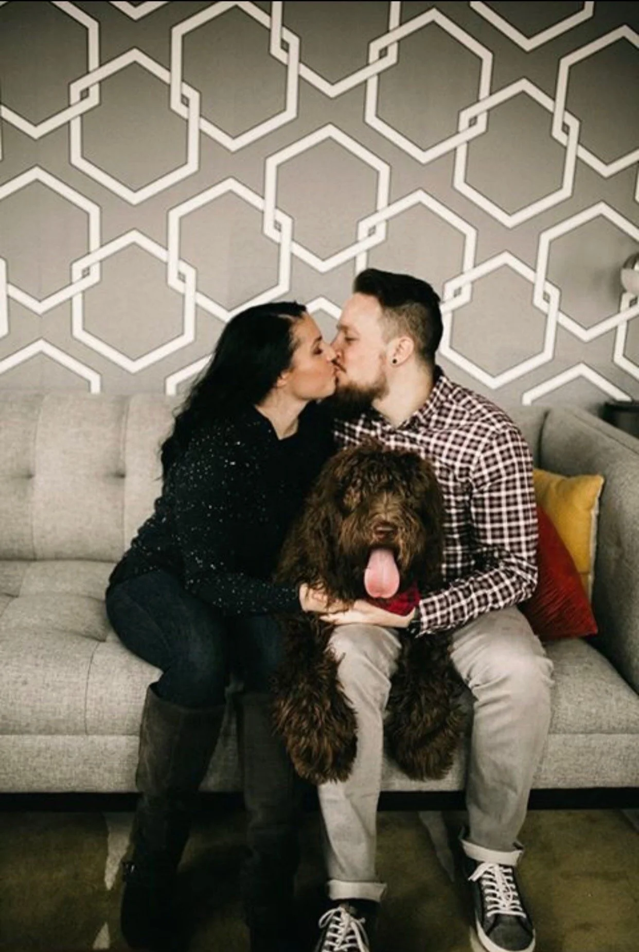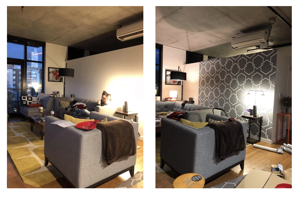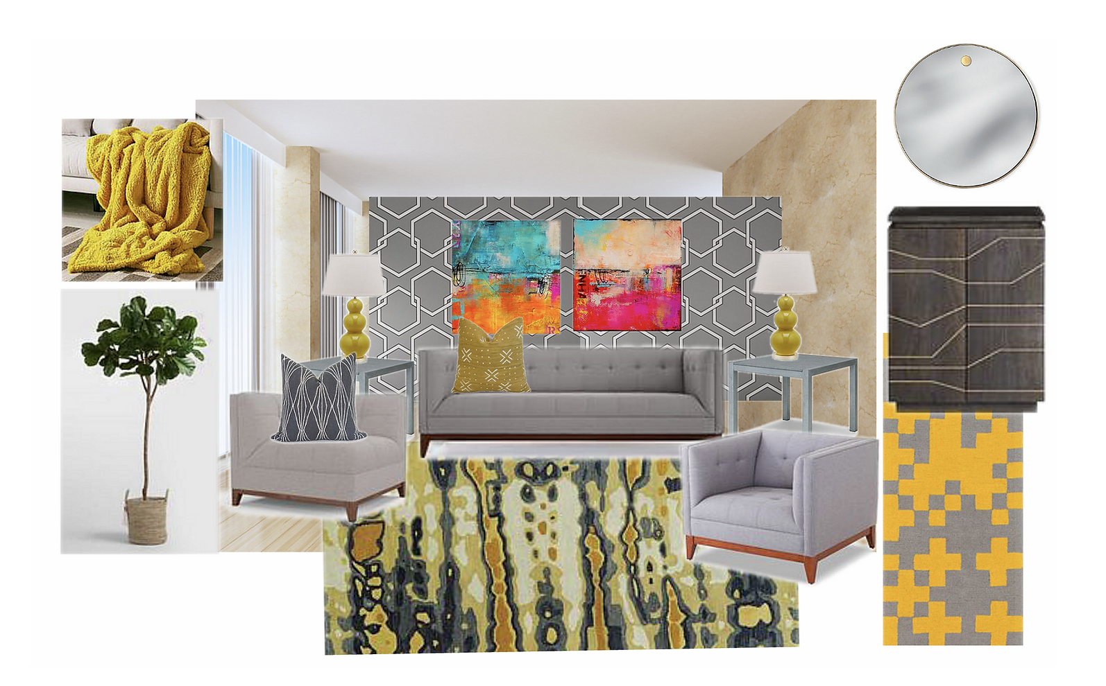 I started with a mood board which is a way to visually communicate the aesthetic in a 1-sheet format.The mood board featured their existing modern gray upholstered furniture from Joybird layered in with well-priced accents and accessories from easy-to-access online retailers. I featured temp-paper (removable wallpaper created specifically with apartment dwellers in mind) and big impact color in contained (read: less scary to the color-phobe) doses in the form of throw pillows, art area rugs along with simple, modern lamps, end tables and bar cabinet.
