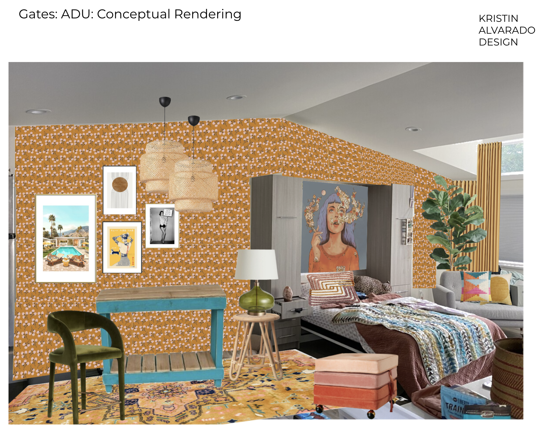 With a furniture and decor project, the process typically begins with an aesthetic concept . One of the easiest ways to communicate an overall aesthetic is by using a “mood board”. A mood board communicates the conceptual look and feel of a space using examples of furnishings, soft goods (rugs, curtains, throw pillows etc), color palette, art and decorative items.