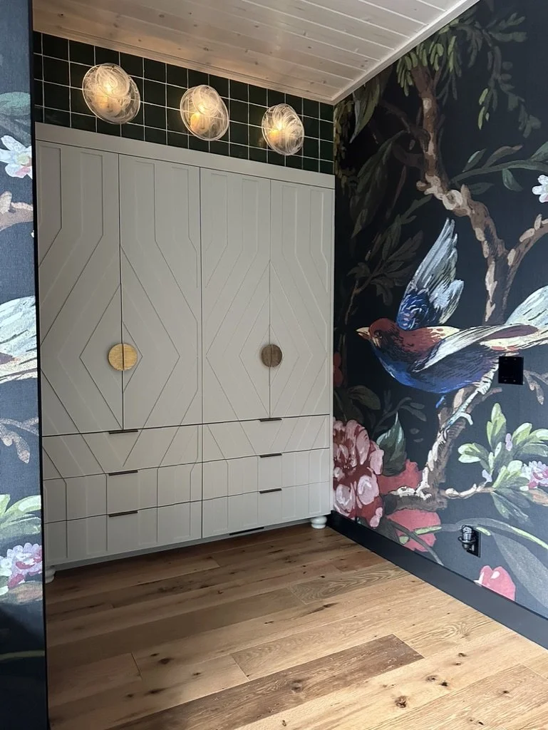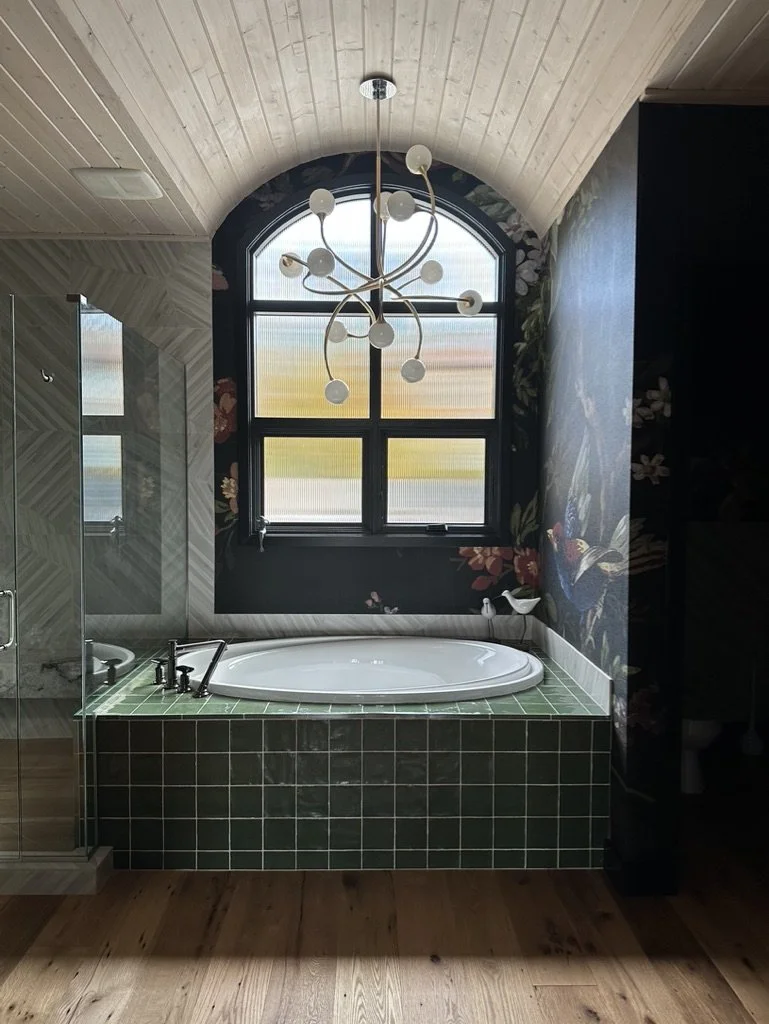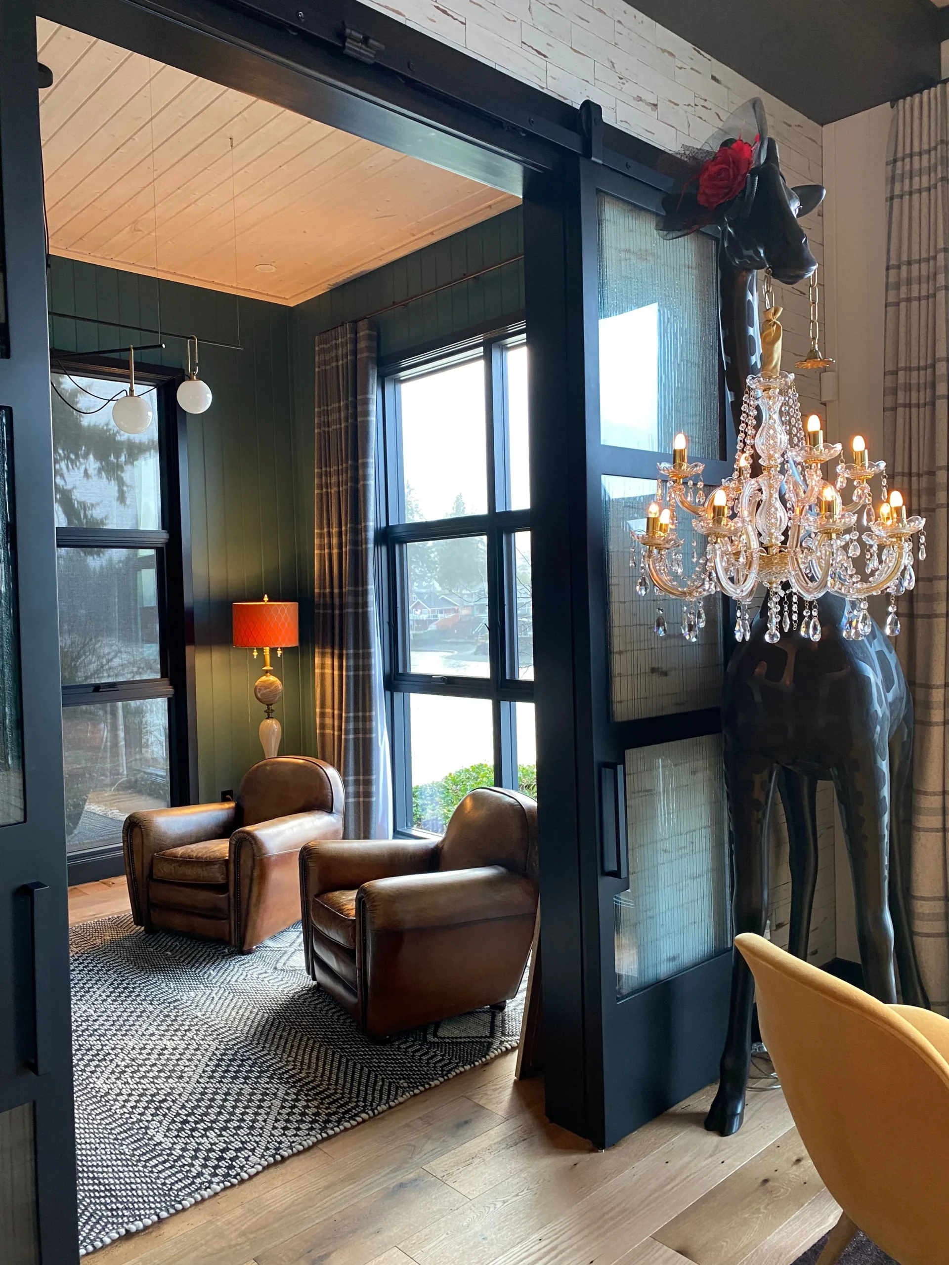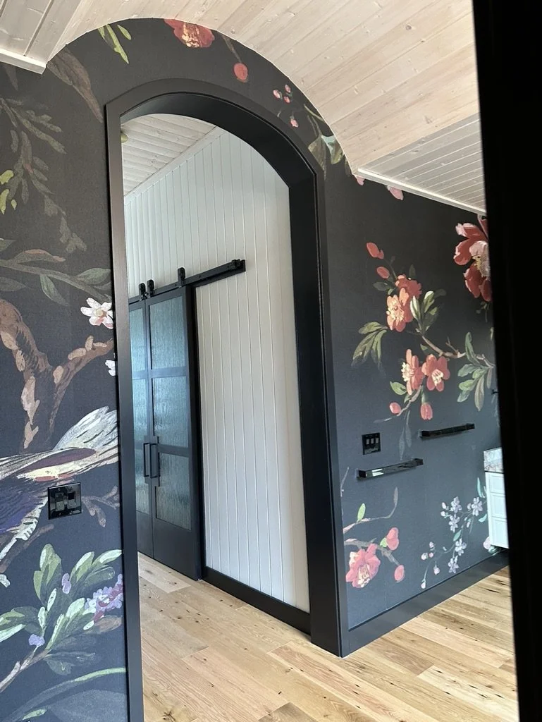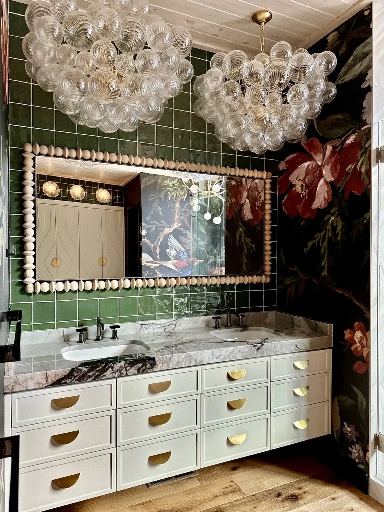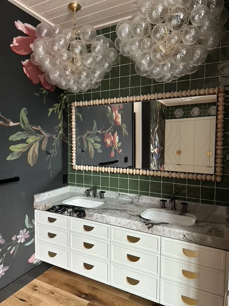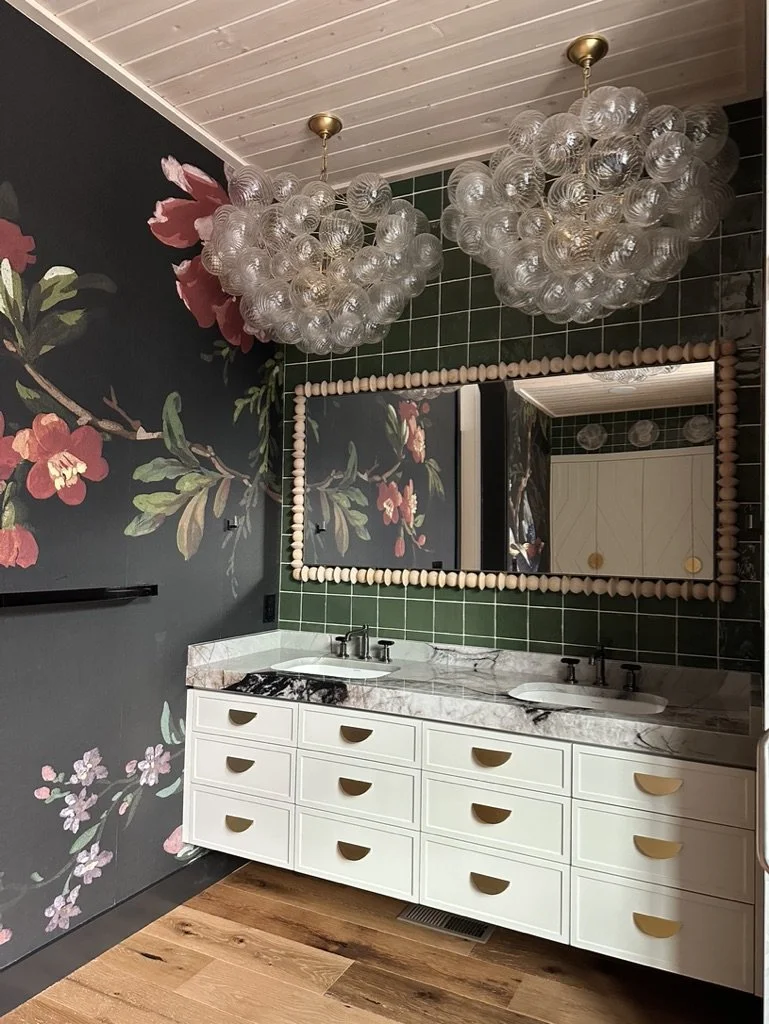 What began as a simple paint consultation for the primary bathroom quickly evolved into a full-scale, whole-house transformation. Every surface was reimagined—from walls to ceilings, floors to furnishings. Wide plank reclaimed flooring grounds the home, while 10-foot metal-and-glass barn doors create dramatic passages between spaces. Enormous glass chandeliers punctuate rooms with lighthearted grandeur, while custom furniture, draperies, rugs, and original artwork infuse personality throughout. Bold, playful wallpapers and layered textures bring energy and visual delight to every corner. Architectural details—including arched doorways, a river rock fireplace, and a soapstone-clad fireplace in the primary suite—add depth and tactile richness. In the powder room, a pink and brown onyx floating vanity serves as a sculptural centerpiece, combining luxury with utility, while in the primary bath, the massive birds-and-flowers wallpaper mural makes us feel Lilliputian by comparison. The design balances modern interventions with material-driven warmth, resulting in a home that is visually captivating, playful, and richly layered. And the cherry on top? A 7-foot-tall giraffe holding an Italian crystal chandelier in its mouth.