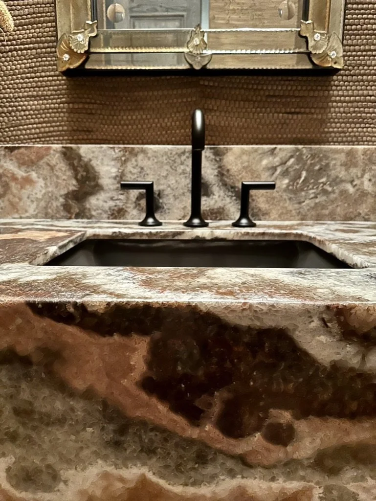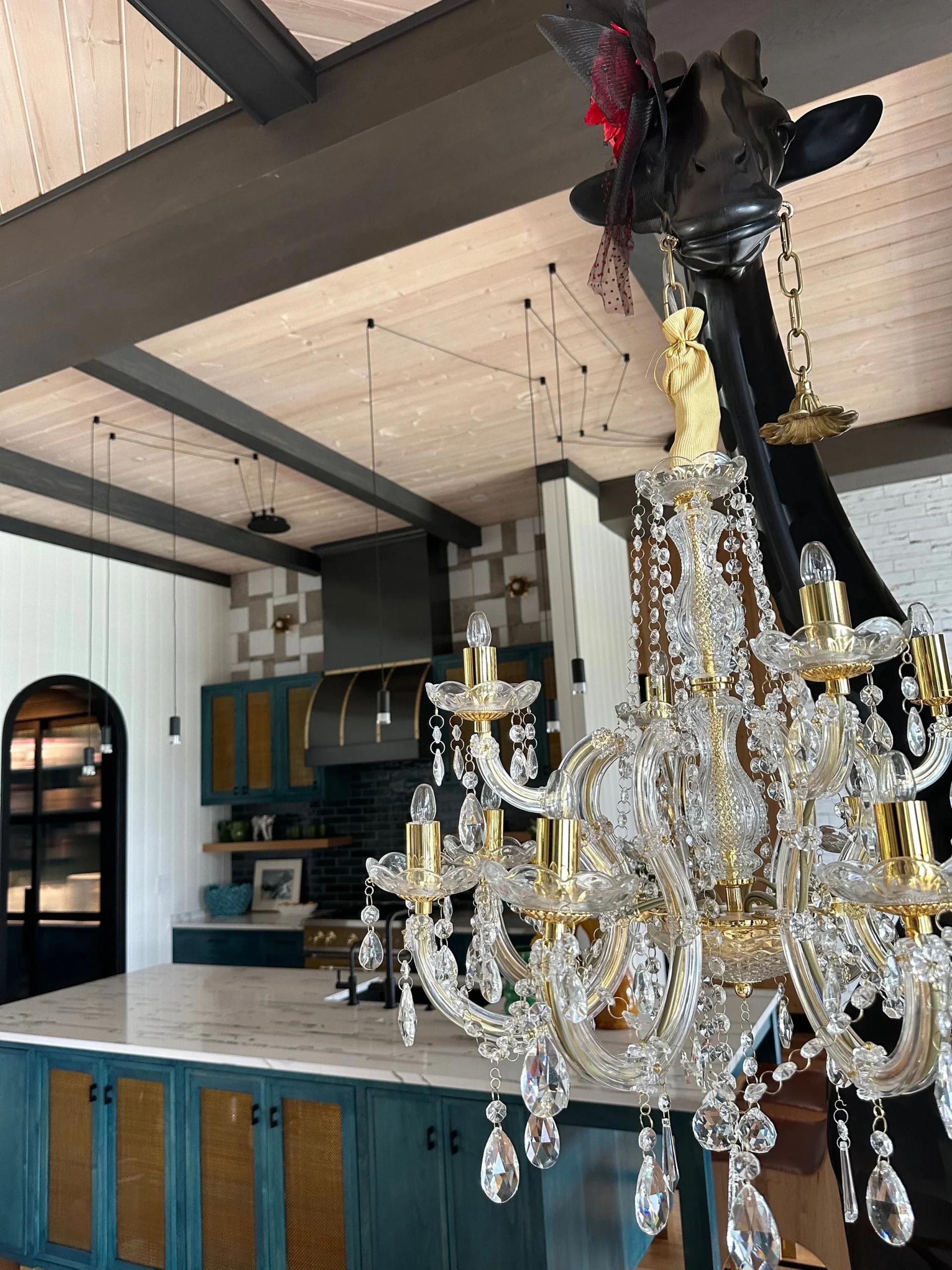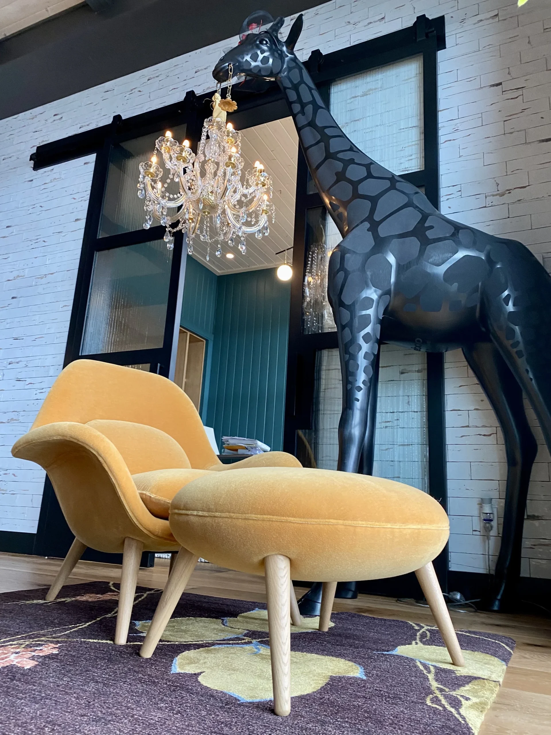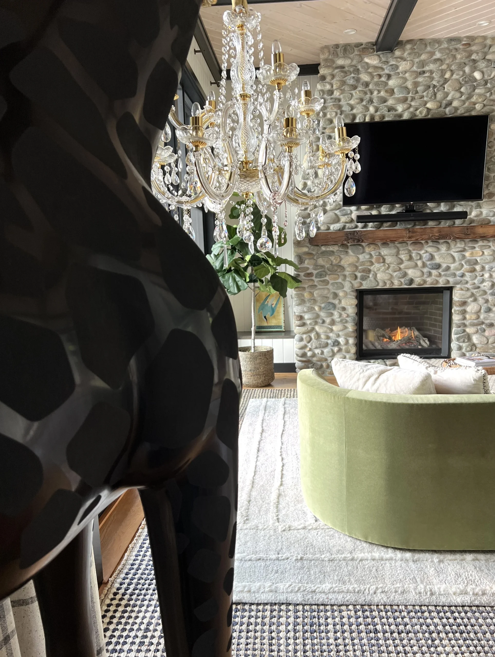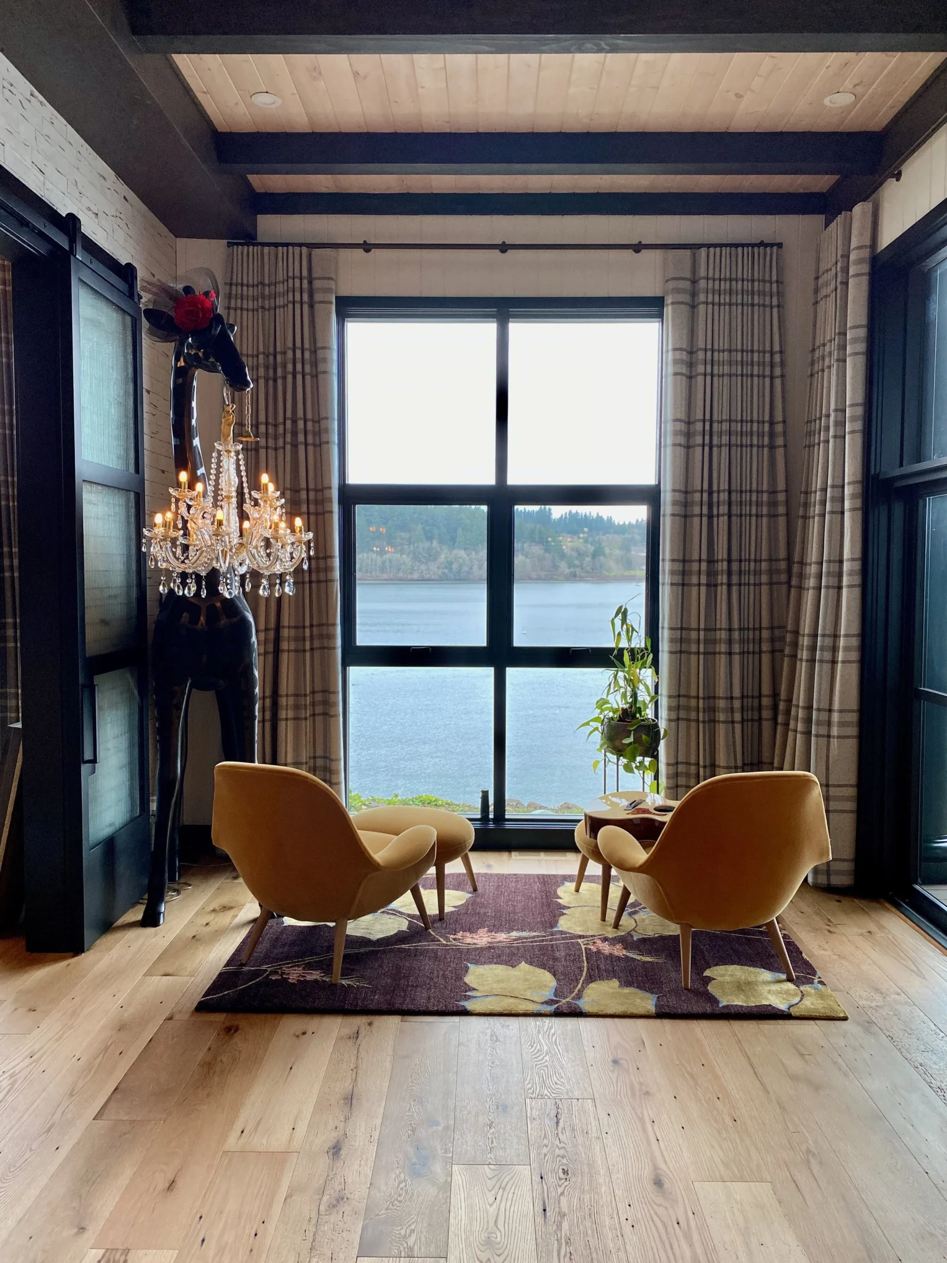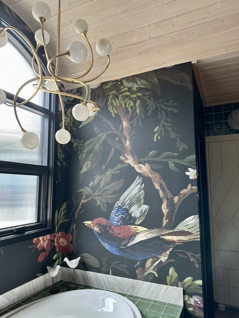 What began as a simple paint consultation for the primary bathroom quickly evolved into a full-scale, whole-house transformation. Every surface was reimagined—from walls to ceilings, floors to furnishings. Wide plank reclaimed flooring grounds the home, while 10-foot metal-and-glass barn doors create dramatic passages between spaces. Enormous glass chandeliers punctuate rooms with lighthearted grandeur, while custom furniture, draperies, rugs, and original artwork infuse personality throughout. Bold, playful wallpapers and layered textures bring energy and visual delight to every corner. Architectural details—including arched doorways, a river rock fireplace, and a soapstone-clad fireplace in the primary suite—add depth and tactile richness. In the powder room, a pink and brown onyx floating vanity serves as a sculptural centerpiece, combining luxury with utility, while in the primary bath, the massive birds-and-flowers wallpaper mural makes us feel Lilliputian by comparison. The design balances modern interventions with material-driven warmth, resulting in a home that is visually captivating, playful, and richly layered. And the cherry on top? A 7-foot-tall giraffe holding an Italian crystal chandelier in its mouth.