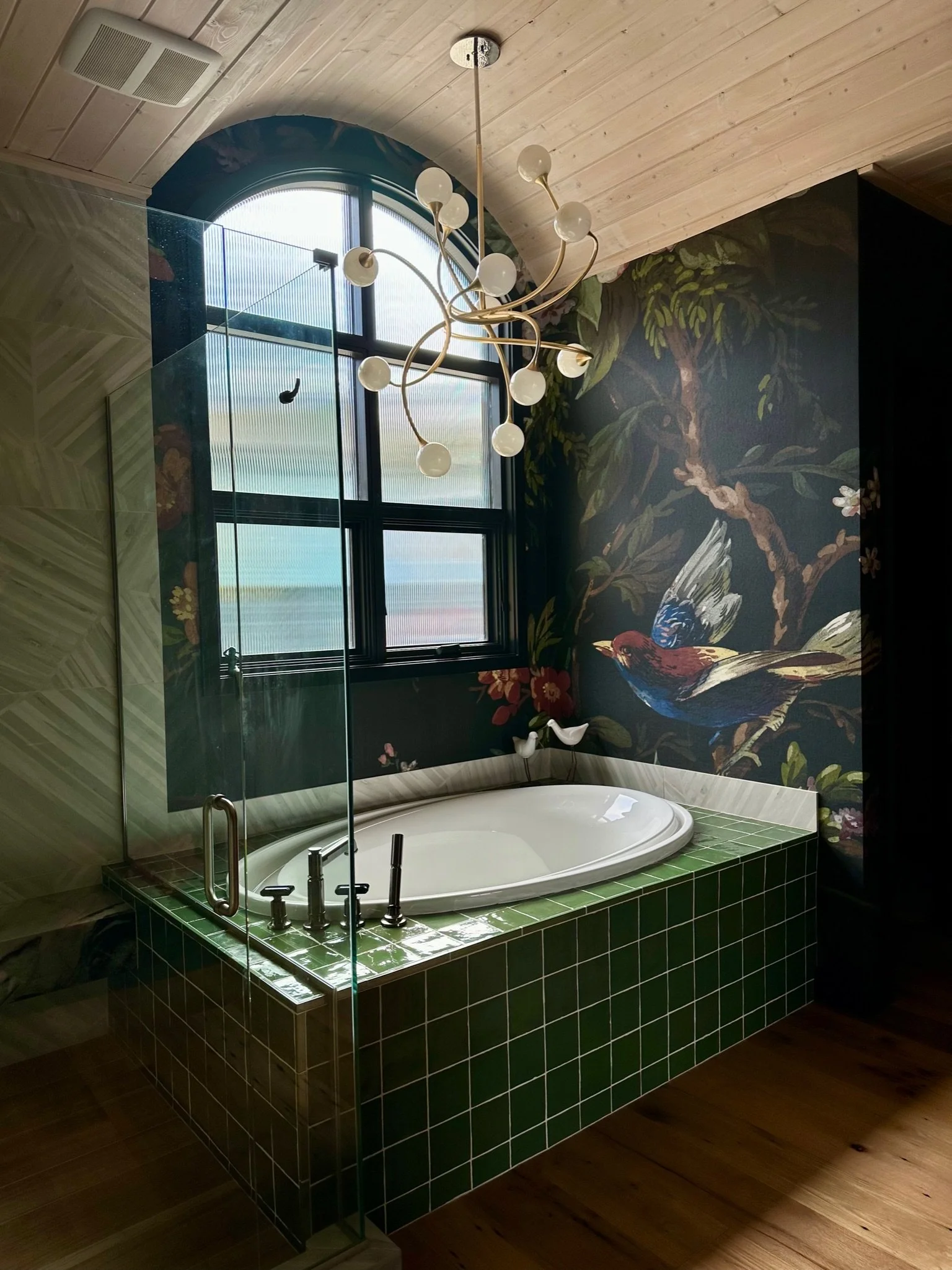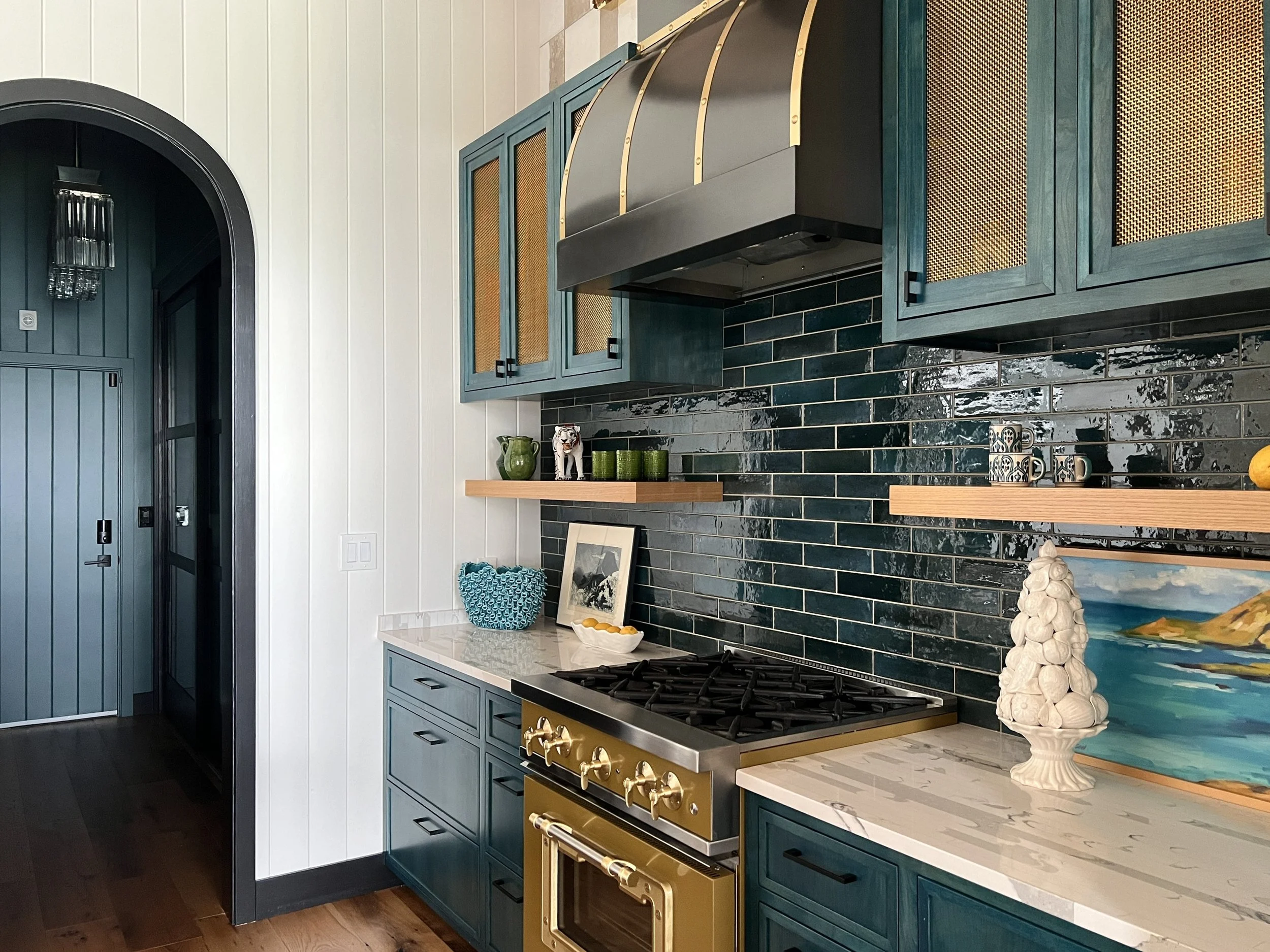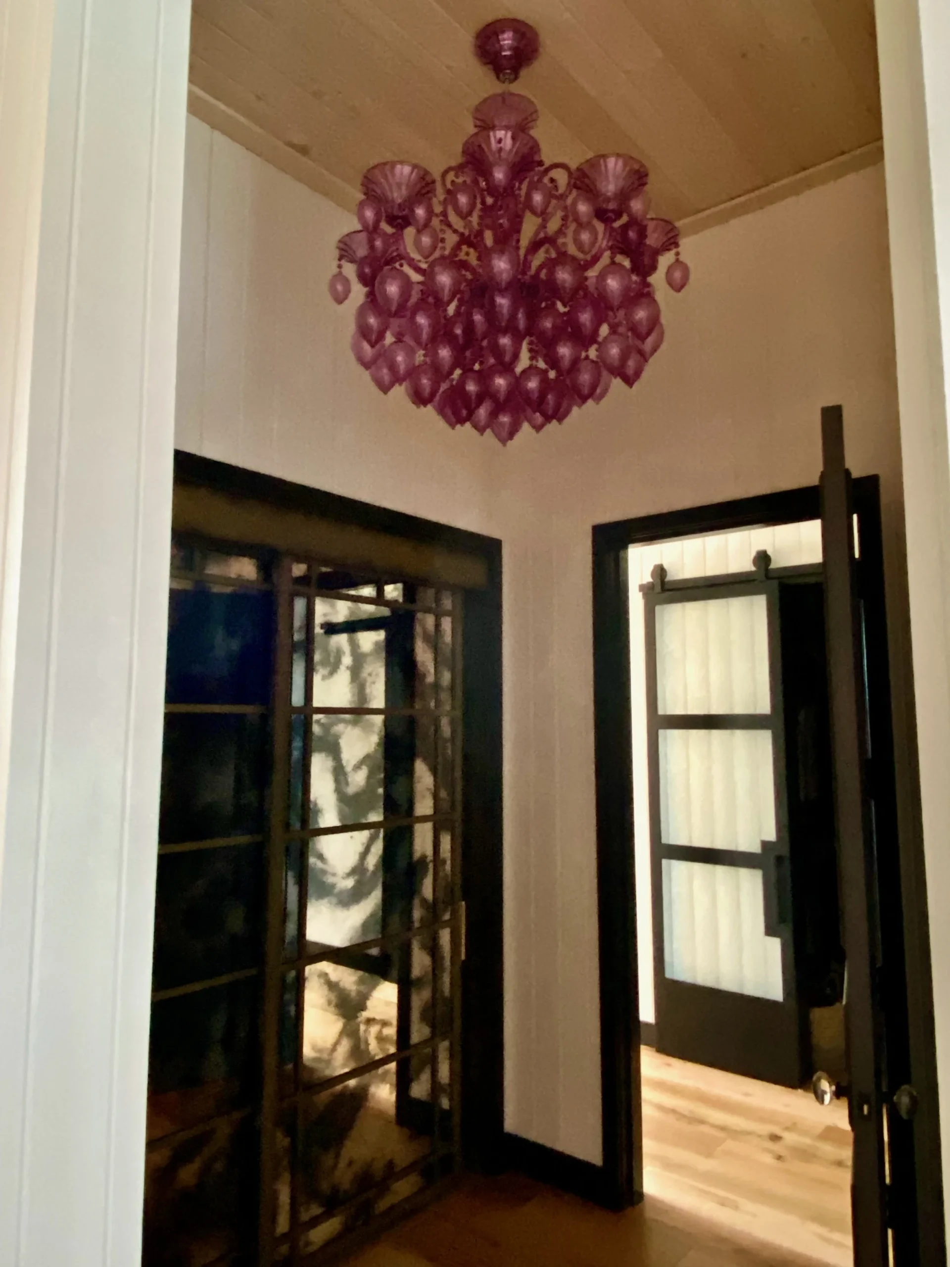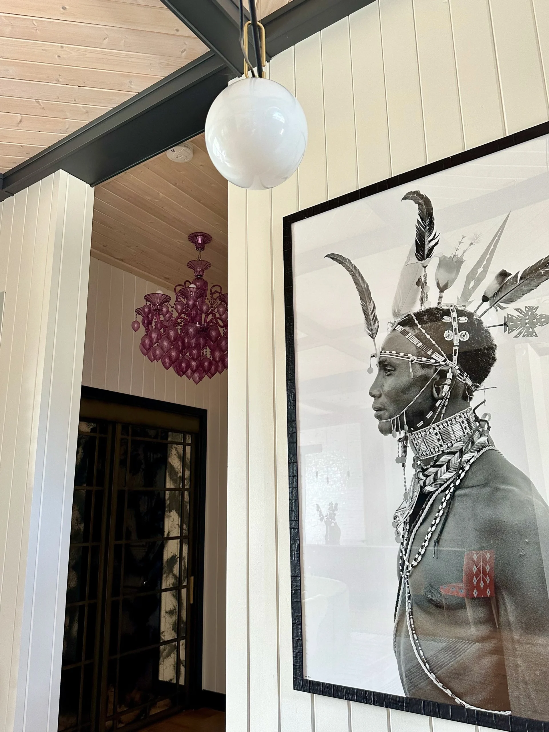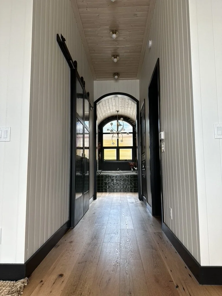 What began as a simple paint consultation for the primary bathroom quickly evolved into a full-scale, whole-house transformation. Every surface was reimagined—from walls to ceilings, floors to furnishings. Wide plank reclaimed flooring grounds the home, while 10-foot metal-and-glass barn doors create dramatic passages between spaces. Enormous glass chandeliers punctuate rooms with lighthearted grandeur, while custom furniture, draperies, rugs, and original artwork infuse personality throughout. Bold, playful wallpapers and layered textures bring energy and visual delight to every corner. Architectural details—including arched doorways, a river rock fireplace, and a soapstone-clad fireplace in the primary suite—add depth and tactile richness. In the powder room, a pink and brown onyx floating vanity serves as a sculptural centerpiece, combining luxury with utility, while in the primary bath, the massive birds-and-flowers wallpaper mural makes us feel Lilliputian by comparison. The design balances modern interventions with material-driven warmth, resulting in a home that is visually captivating, playful, and richly layered. And the cherry on top? A 7-foot-tall giraffe holding an Italian crystal chandelier in its mouth.
