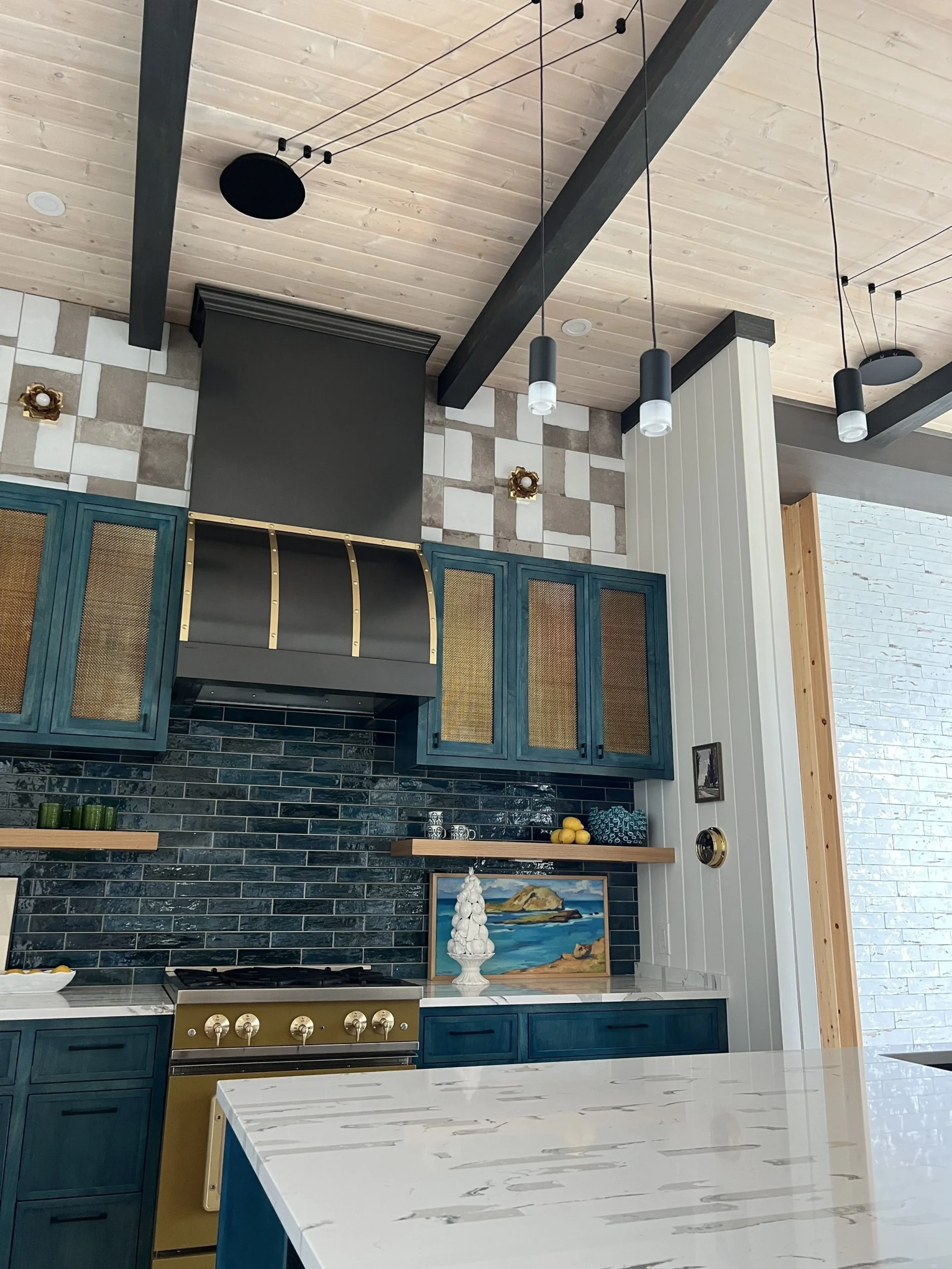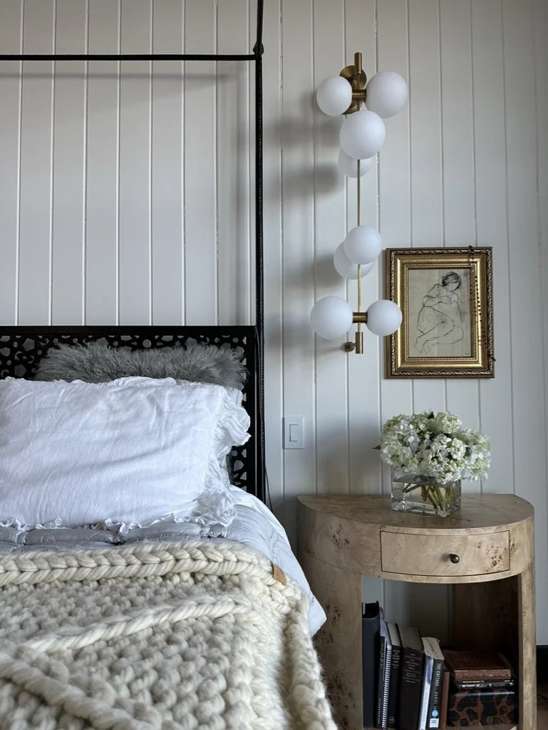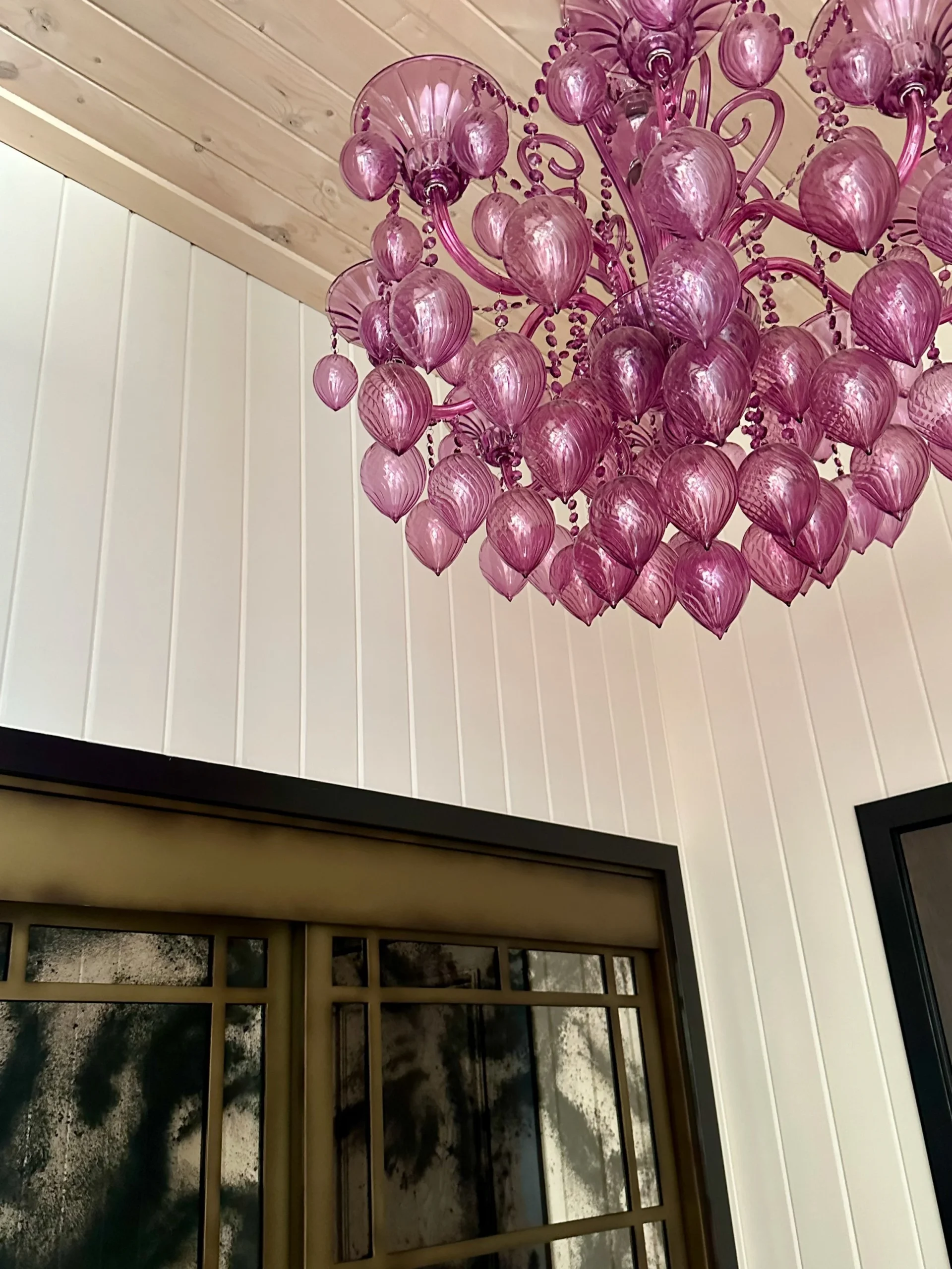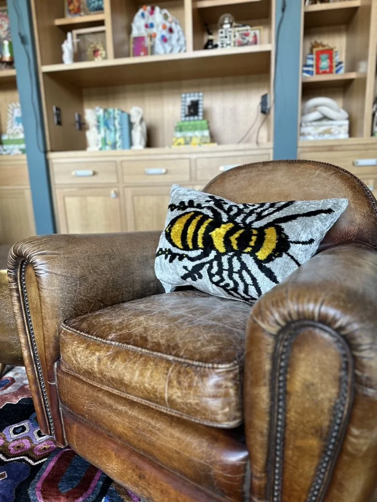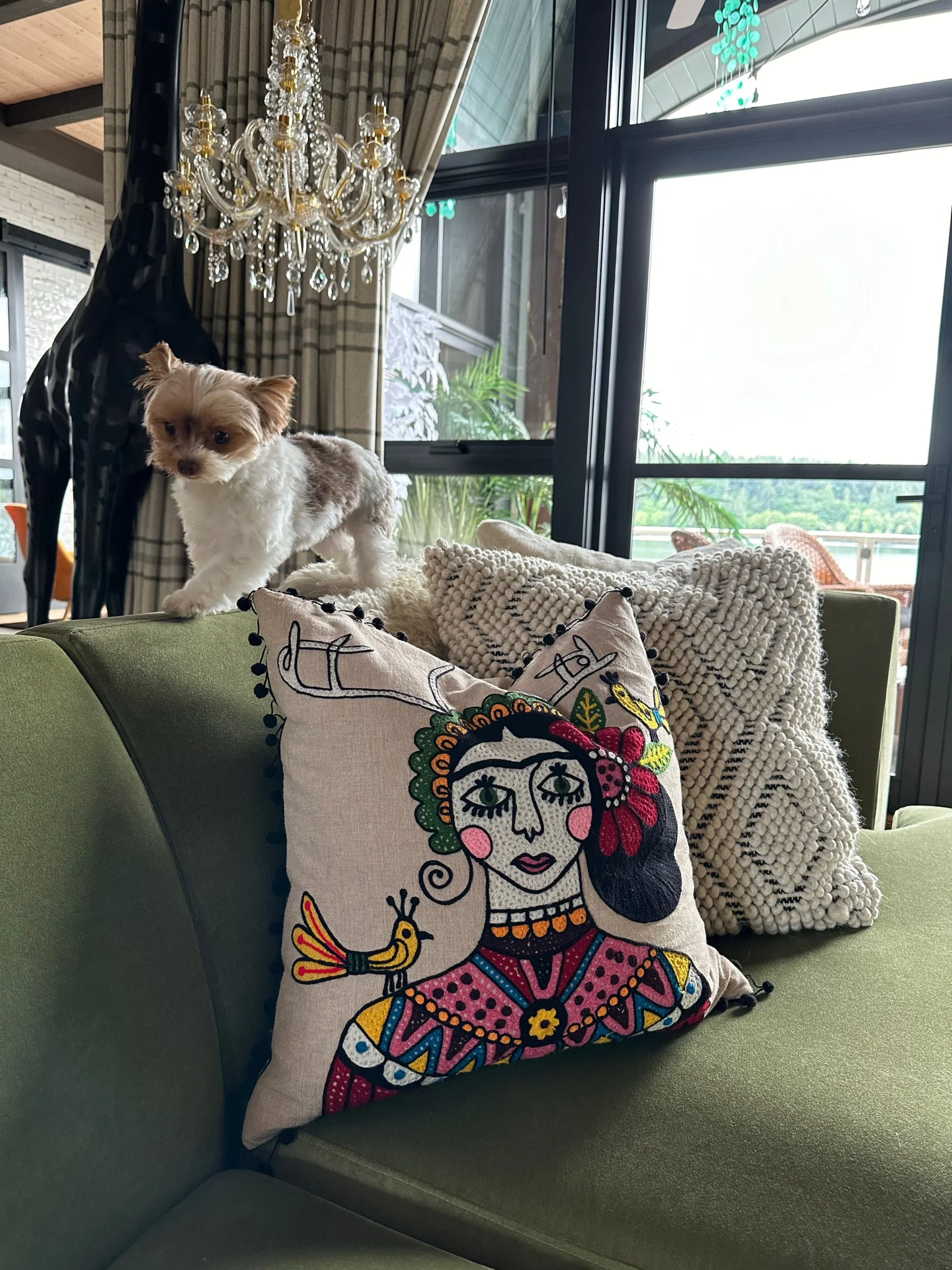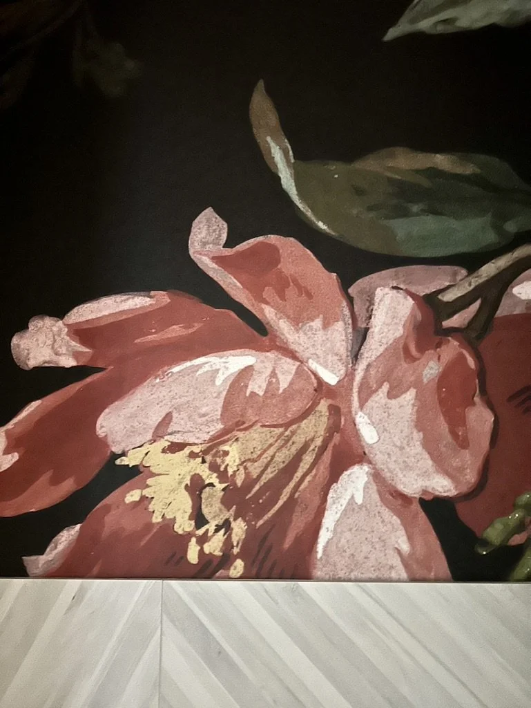 What began as a simple paint consultation for the primary bathroom quickly evolved into a full-scale, whole-house transformation. Every surface was reimagined—from walls to ceilings, floors to furnishings. Wide plank reclaimed flooring grounds the home, while 10-foot metal-and-glass barn doors create dramatic passages between spaces. Enormous glass chandeliers punctuate rooms with lighthearted grandeur, while custom furniture, draperies, rugs, and original artwork infuse personality throughout. Bold, playful wallpapers and layered textures bring energy and visual delight to every corner. Architectural details—including arched doorways, a river rock fireplace, and a soapstone-clad fireplace in the primary suite—add depth and tactile richness. In the powder room, a pink and brown onyx floating vanity serves as a sculptural centerpiece, combining luxury with utility, while in the primary bath, the massive birds-and-flowers wallpaper mural makes us feel Lilliputian by comparison. The design balances modern interventions with material-driven warmth, resulting in a home that is visually captivating, playful, and richly layered. And the cherry on top? A 7-foot-tall giraffe holding an Italian crystal chandelier in its mouth.