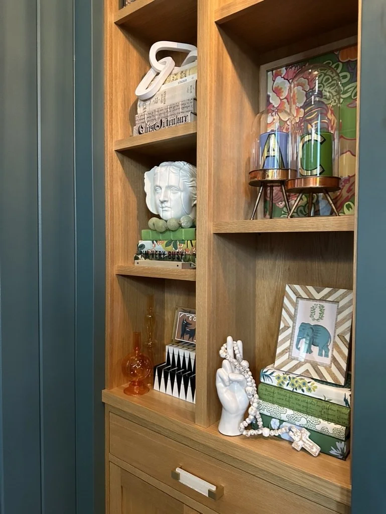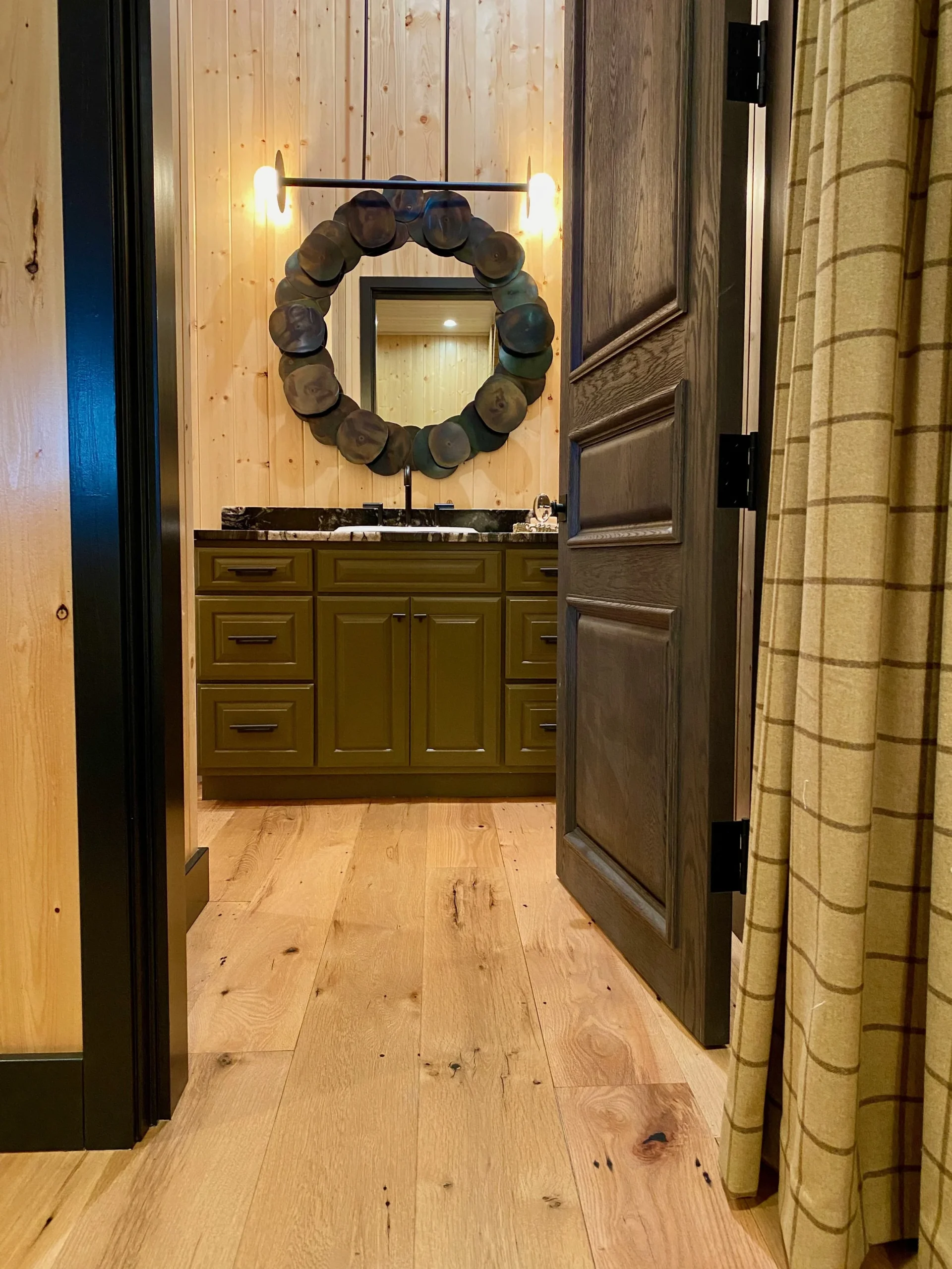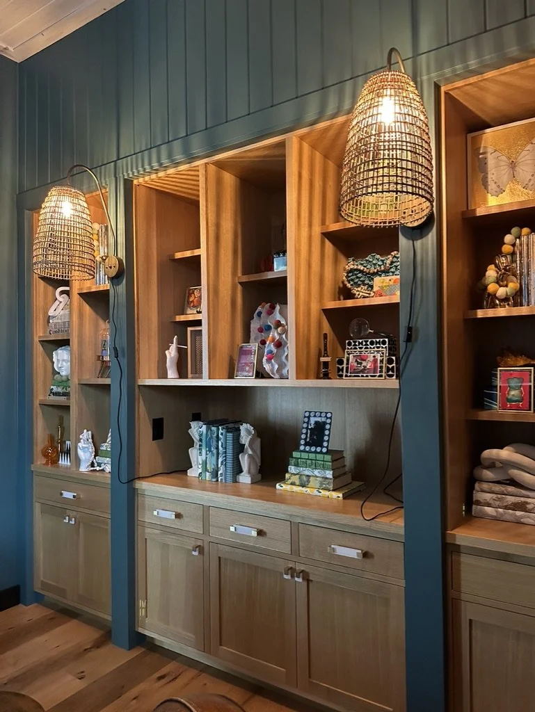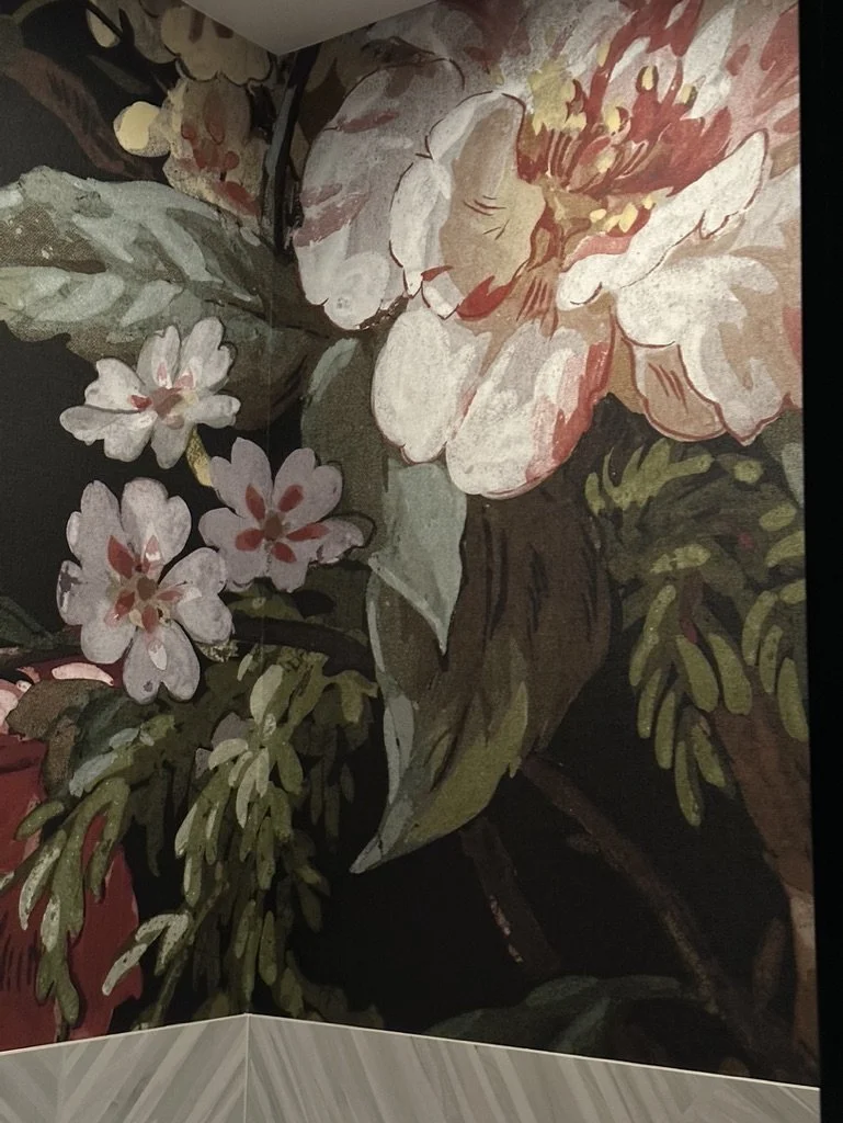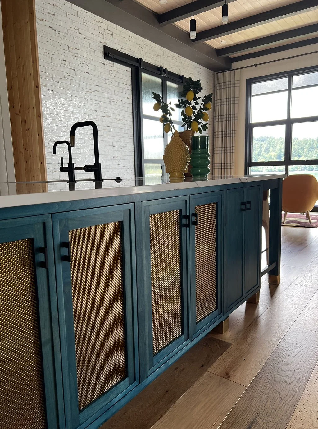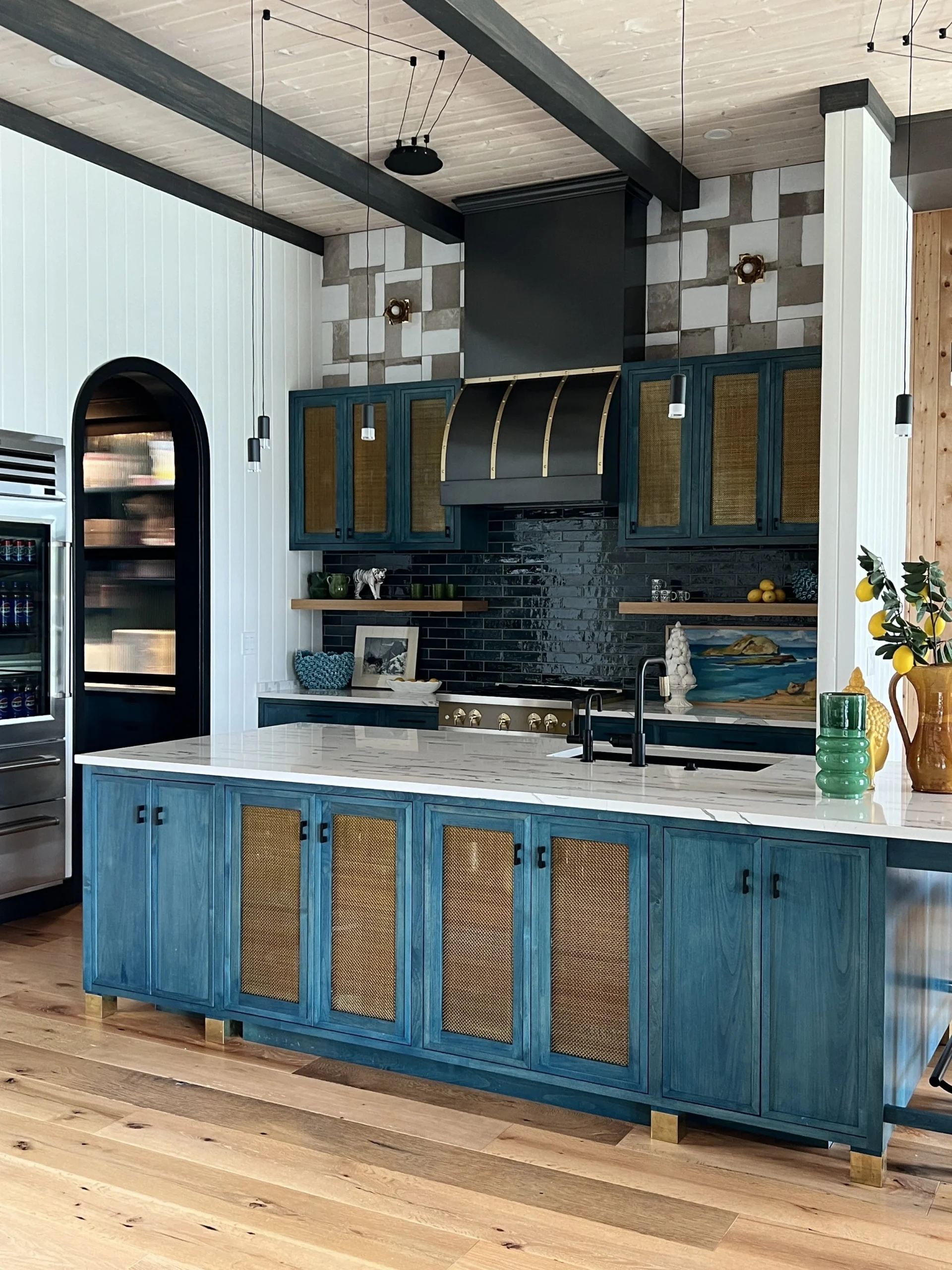 What began as a simple paint consultation for the primary bathroom quickly evolved into a full-scale, whole-house transformation. Every surface was reimagined—from walls to ceilings, floors to furnishings. Wide plank reclaimed flooring grounds the home, while 10-foot metal-and-glass barn doors create dramatic passages between spaces. Enormous glass chandeliers punctuate rooms with lighthearted grandeur, while custom furniture, draperies, rugs, and original artwork infuse personality throughout. Bold, playful wallpapers and layered textures bring energy and visual delight to every corner. Architectural details—including arched doorways, a river rock fireplace, and a soapstone-clad fireplace in the primary suite—add depth and tactile richness. In the powder room, a pink and brown onyx floating vanity serves as a sculptural centerpiece, combining luxury with utility, while in the primary bath, the massive birds-and-flowers wallpaper mural makes us feel Lilliputian by comparison. The design balances modern interventions with material-driven warmth, resulting in a home that is visually captivating, playful, and richly layered. And the cherry on top? A 7-foot-tall giraffe holding an Italian crystal chandelier in its mouth.