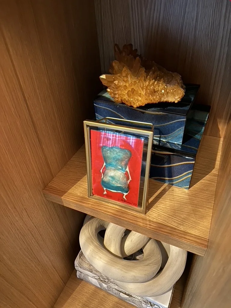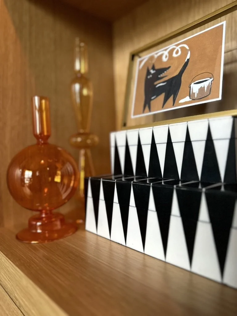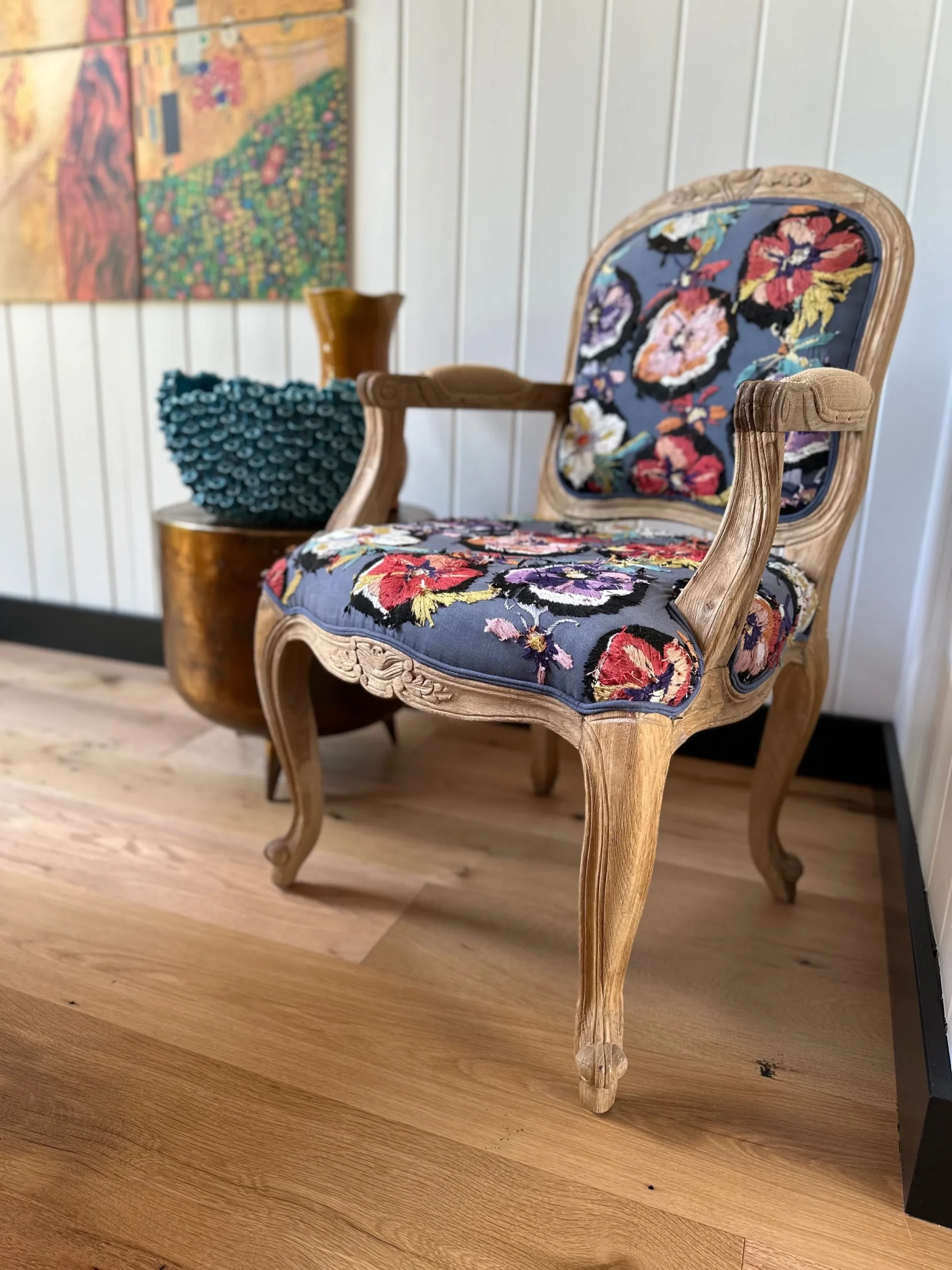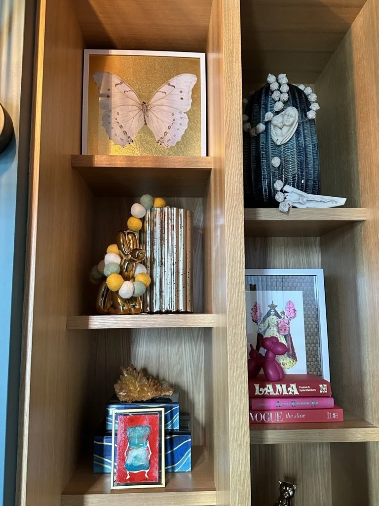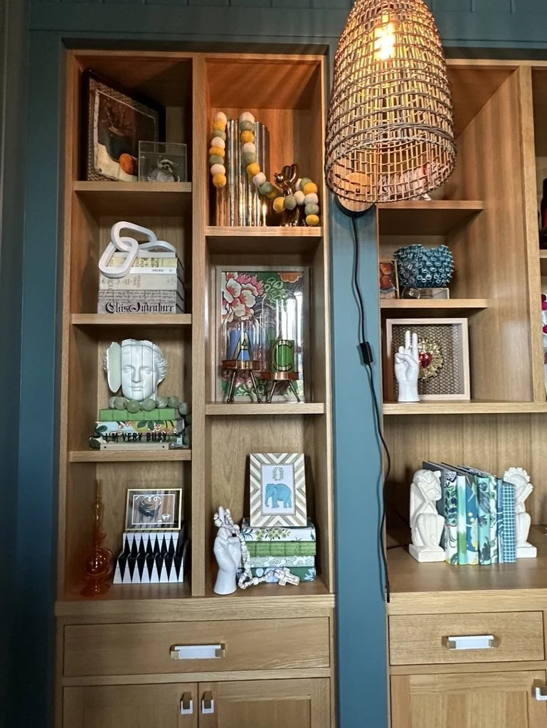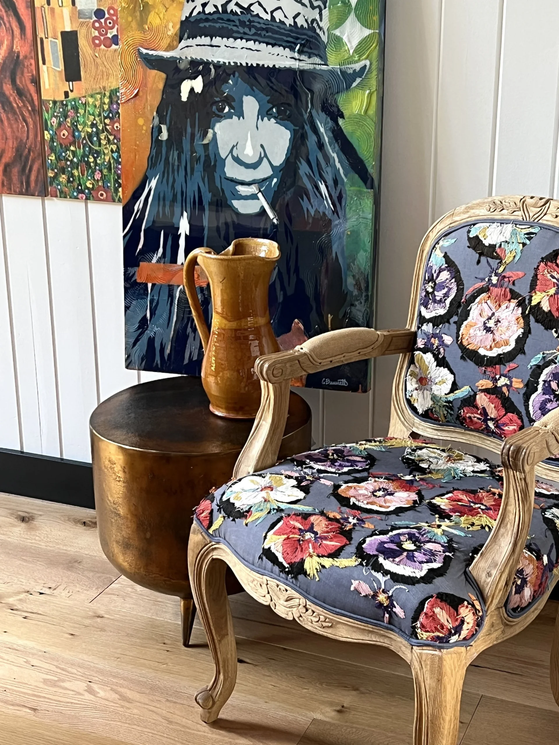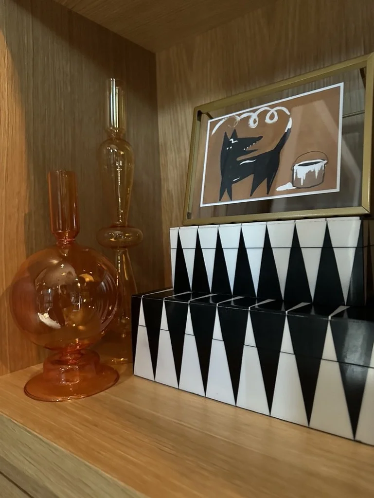 What began as a simple paint consultation for the primary bathroom quickly evolved into a full-scale, whole-house transformation. Every surface was reimagined—from walls to ceilings, floors to furnishings. Wide plank reclaimed flooring grounds the home, while 10-foot metal-and-glass barn doors create dramatic passages between spaces. Enormous glass chandeliers punctuate rooms with lighthearted grandeur, while custom furniture, draperies, rugs, and original artwork infuse personality throughout. Bold, playful wallpapers and layered textures bring energy and visual delight to every corner. Architectural details—including arched doorways, a river rock fireplace, and a soapstone-clad fireplace in the primary suite—add depth and tactile richness. In the powder room, a pink and brown onyx floating vanity serves as a sculptural centerpiece, combining luxury with utility, while in the primary bath, the massive birds-and-flowers wallpaper mural makes us feel Lilliputian by comparison. The design balances modern interventions with material-driven warmth, resulting in a home that is visually captivating, playful, and richly layered. And the cherry on top? A 7-foot-tall giraffe holding an Italian crystal chandelier in its mouth.