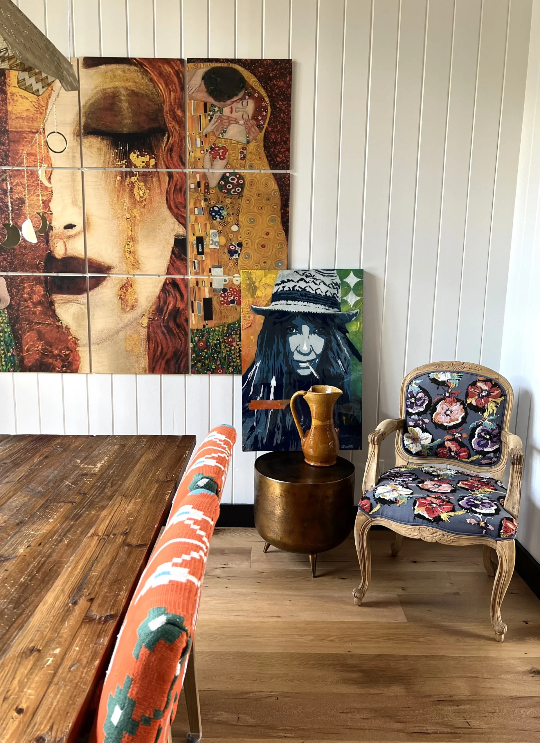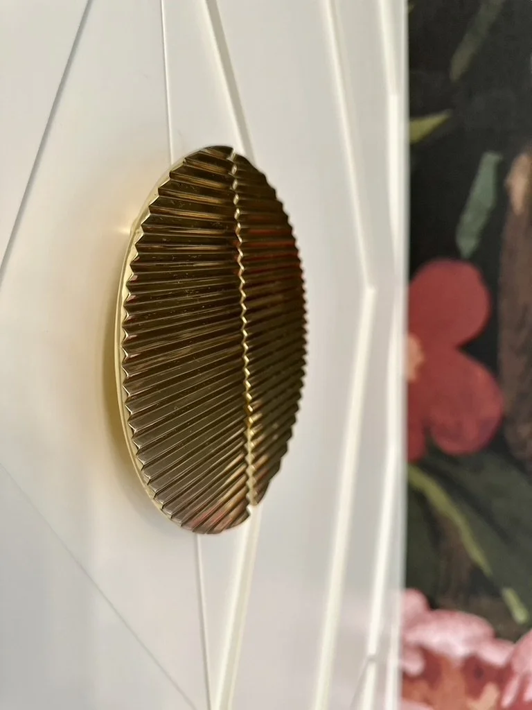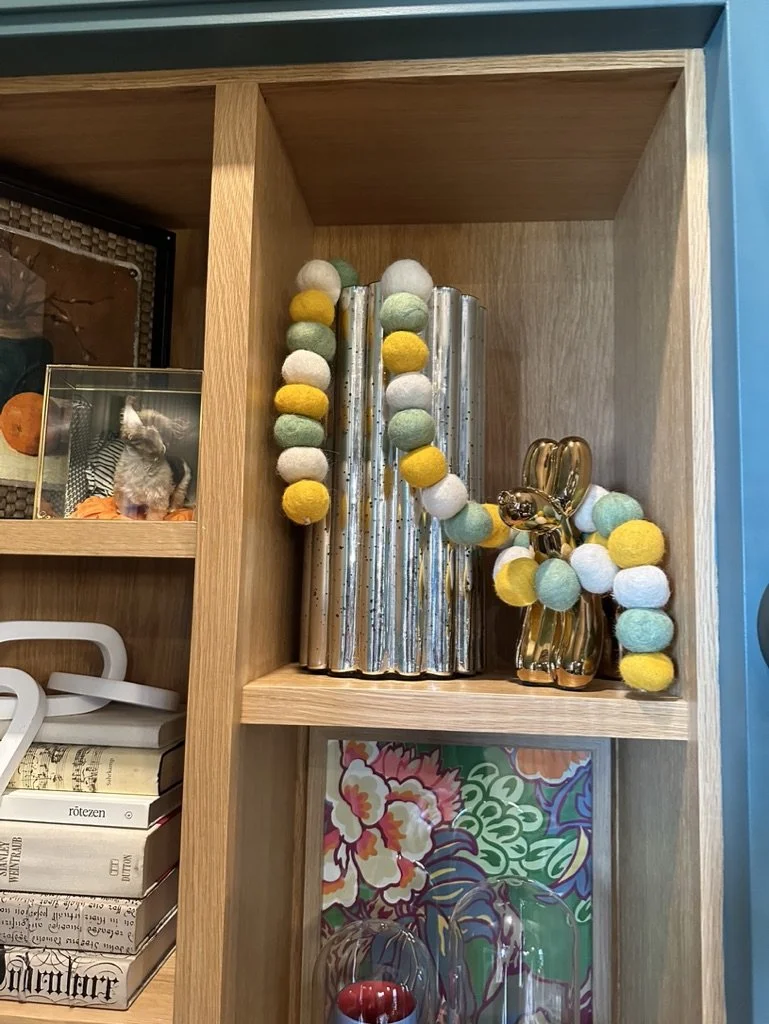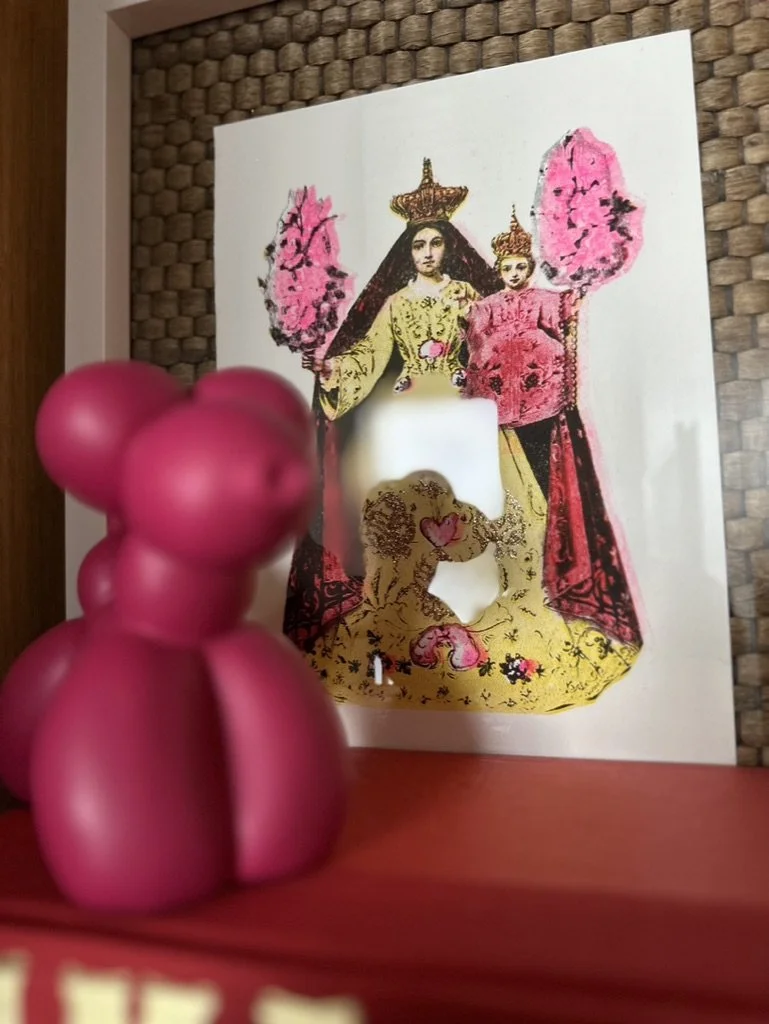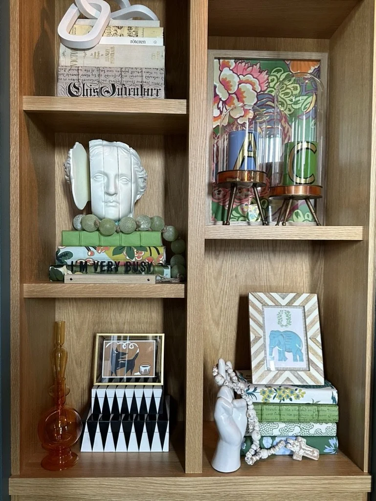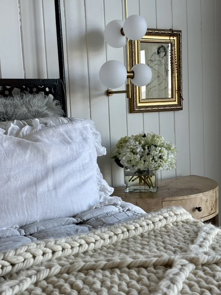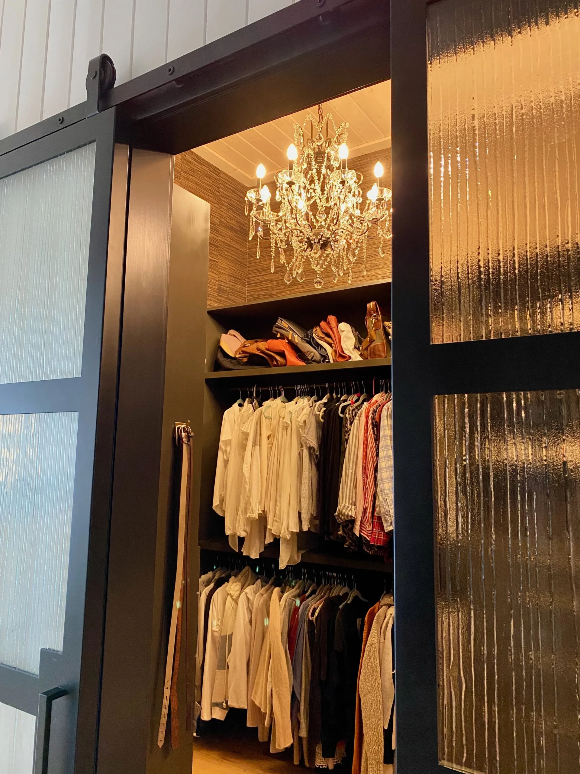 What began as a simple paint consultation for the primary bathroom quickly evolved into a full-scale, whole-house transformation. Every surface was reimagined—from walls to ceilings, floors to furnishings. Wide plank reclaimed flooring grounds the home, while 10-foot metal-and-glass barn doors create dramatic passages between spaces. Enormous glass chandeliers punctuate rooms with lighthearted grandeur, while custom furniture, draperies, rugs, and original artwork infuse personality throughout. Bold, playful wallpapers and layered textures bring energy and visual delight to every corner. Architectural details—including arched doorways, a river rock fireplace, and a soapstone-clad fireplace in the primary suite—add depth and tactile richness. In the powder room, a pink and brown onyx floating vanity serves as a sculptural centerpiece, combining luxury with utility, while in the primary bath, the massive birds-and-flowers wallpaper mural makes us feel Lilliputian by comparison. The design balances modern interventions with material-driven warmth, resulting in a home that is visually captivating, playful, and richly layered. And the cherry on top? A 7-foot-tall giraffe holding an Italian crystal chandelier in its mouth.