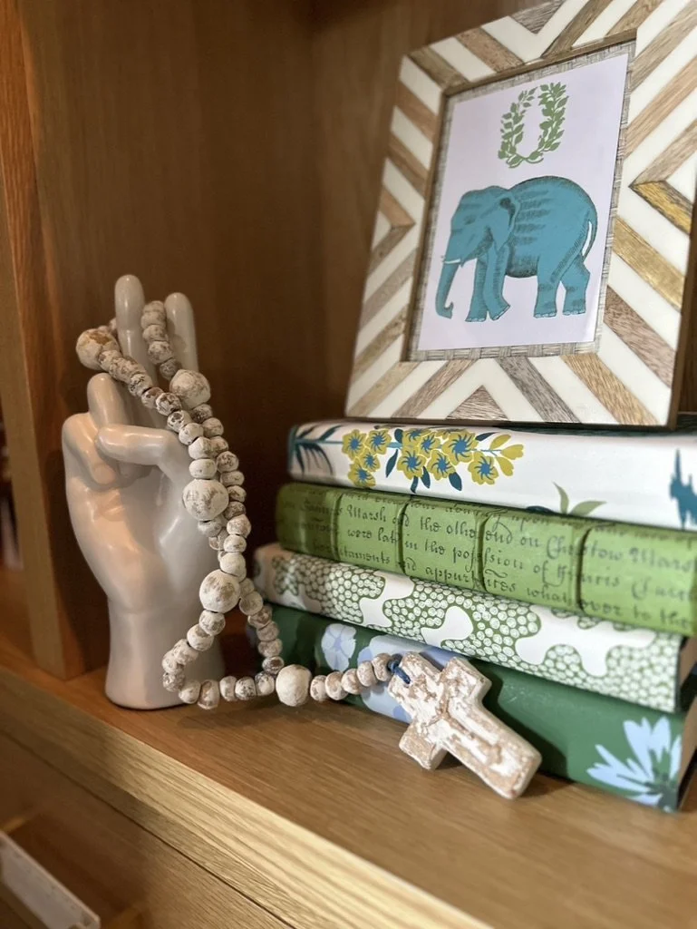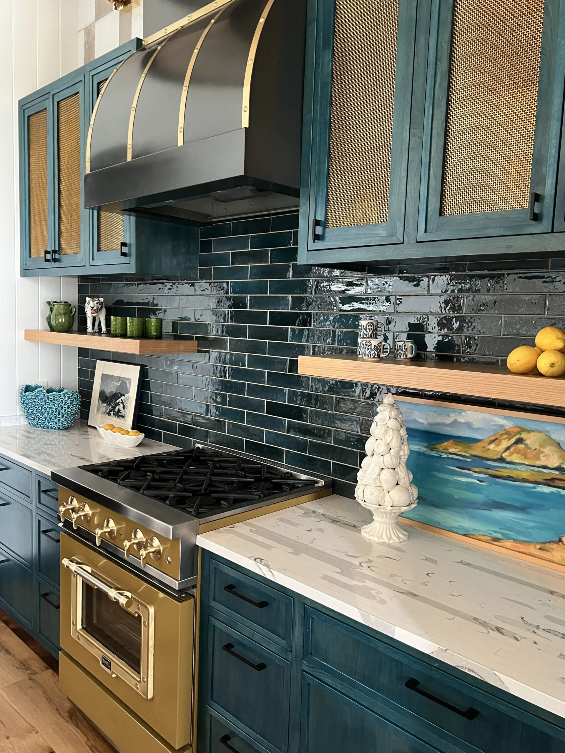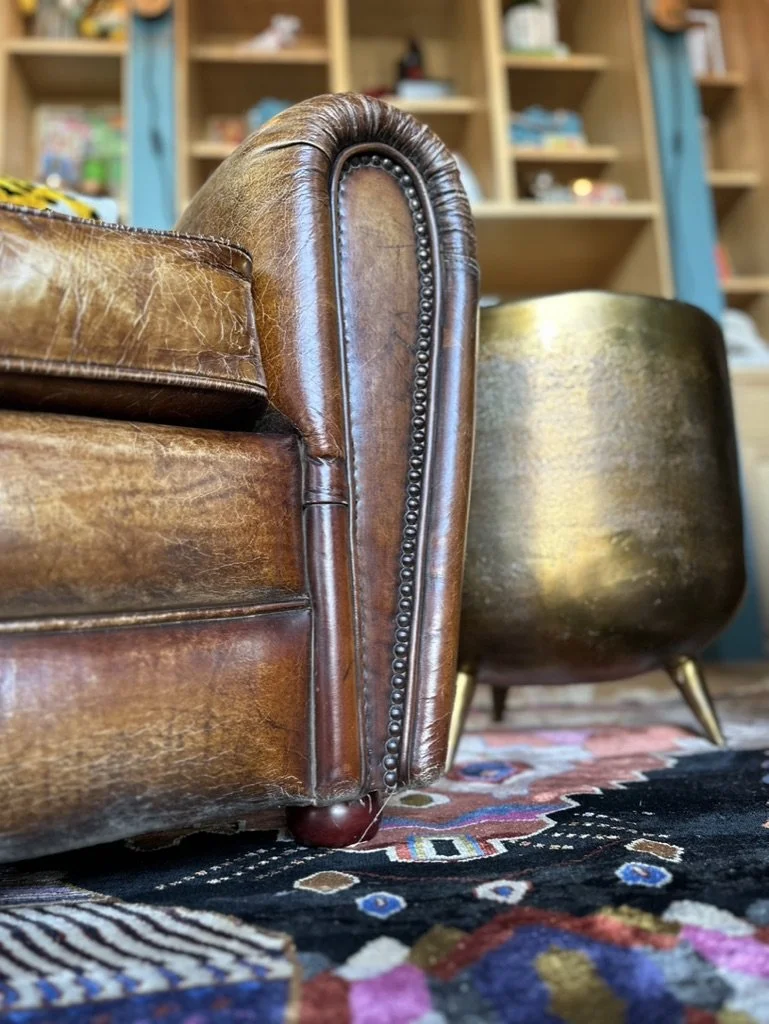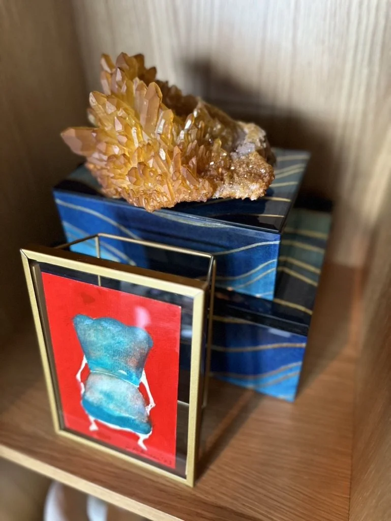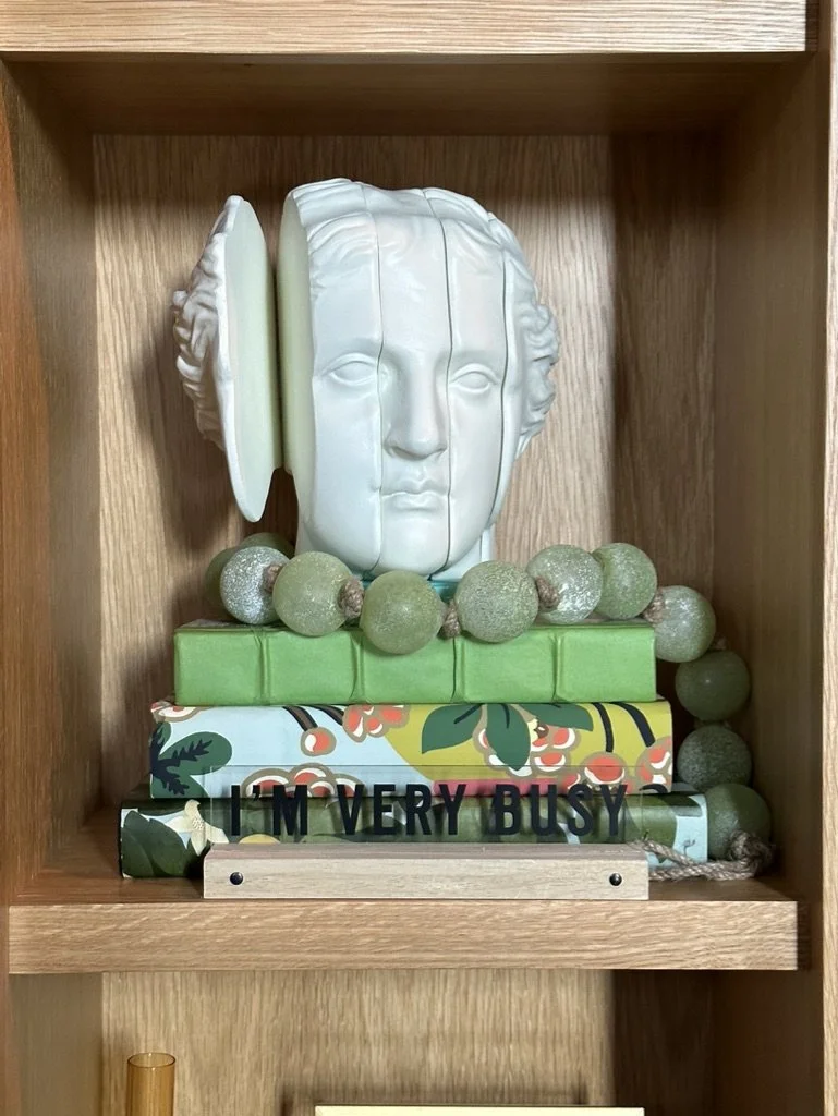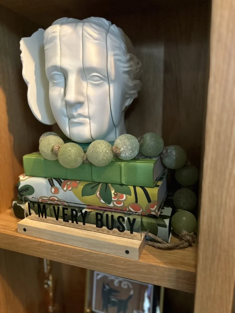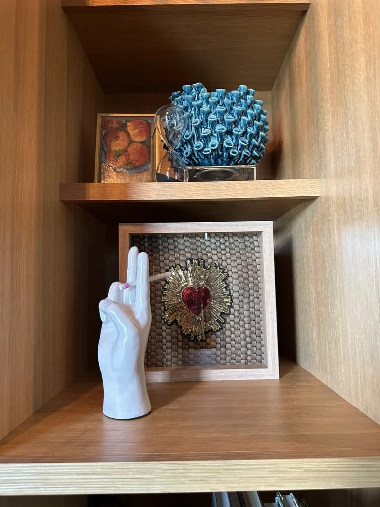What began as a simple paint consultation for the primary bathroom quickly evolved into a full-scale, whole-house transformation. Every surface was reimagined—from walls to ceilings, floors to furnishings. Wide plank reclaimed flooring grounds the home, while 10-foot metal-and-glass barn doors create dramatic passages between spaces. Enormous glass chandeliers punctuate rooms with lighthearted grandeur, while custom furniture, draperies, rugs, and original artwork infuse personality throughout. Bold, playful wallpapers and layered textures bring energy and visual delight to every corner. Architectural details—including arched doorways, a river rock fireplace, and a soapstone-clad fireplace in the primary suite—add depth and tactile richness. In the powder room, a pink and brown onyx floating vanity serves as a sculptural centerpiece, combining luxury with utility, while in the primary bath, the massive birds-and-flowers wallpaper mural makes us feel Lilliputian by comparison. The design balances modern interventions with material-driven warmth, resulting in a home that is visually captivating, playful, and richly layered. And the cherry on top? A 7-foot-tall giraffe holding an Italian crystal chandelier in its mouth.