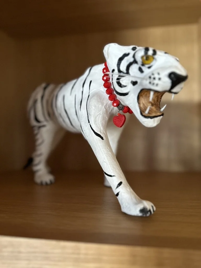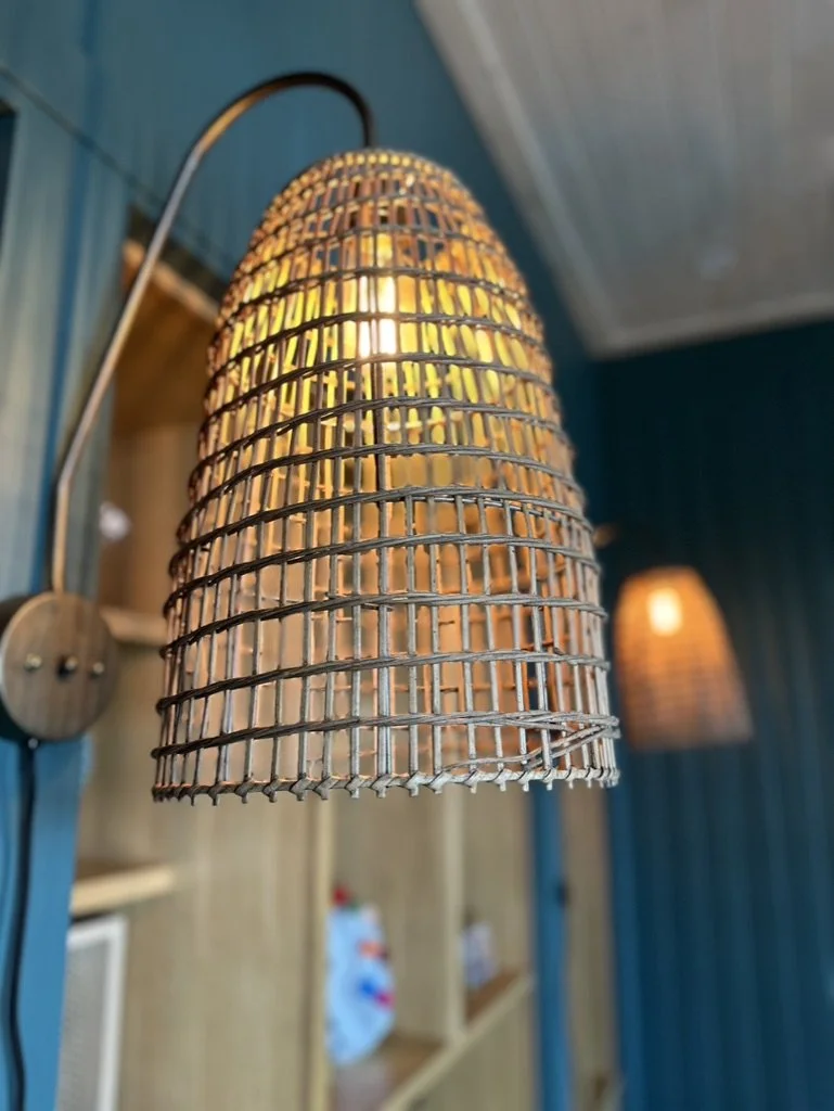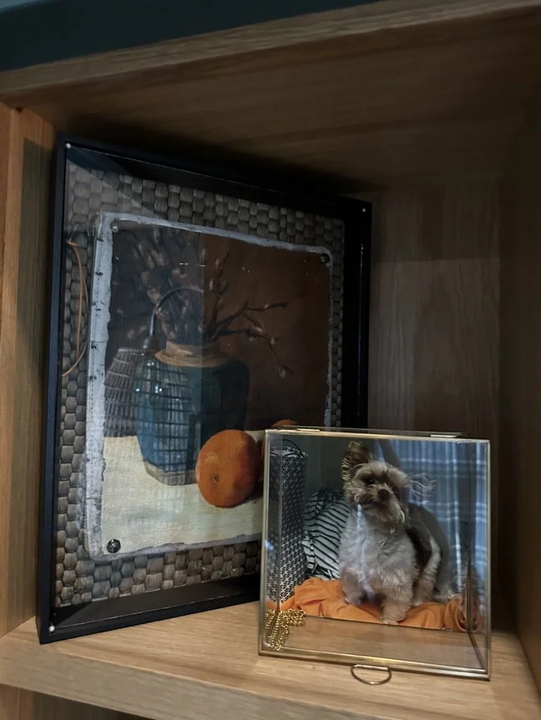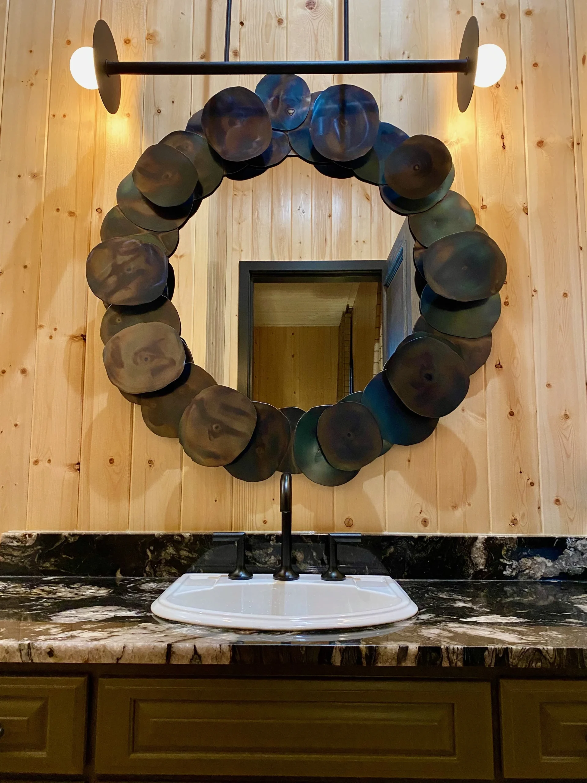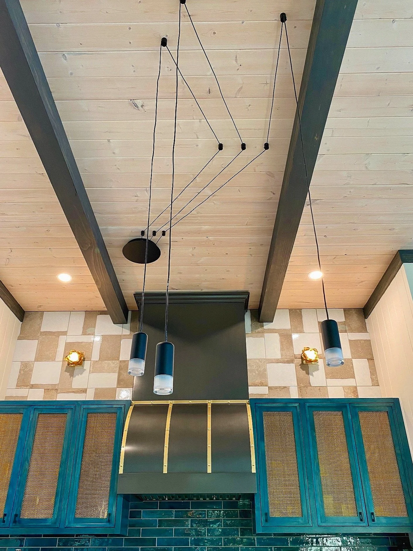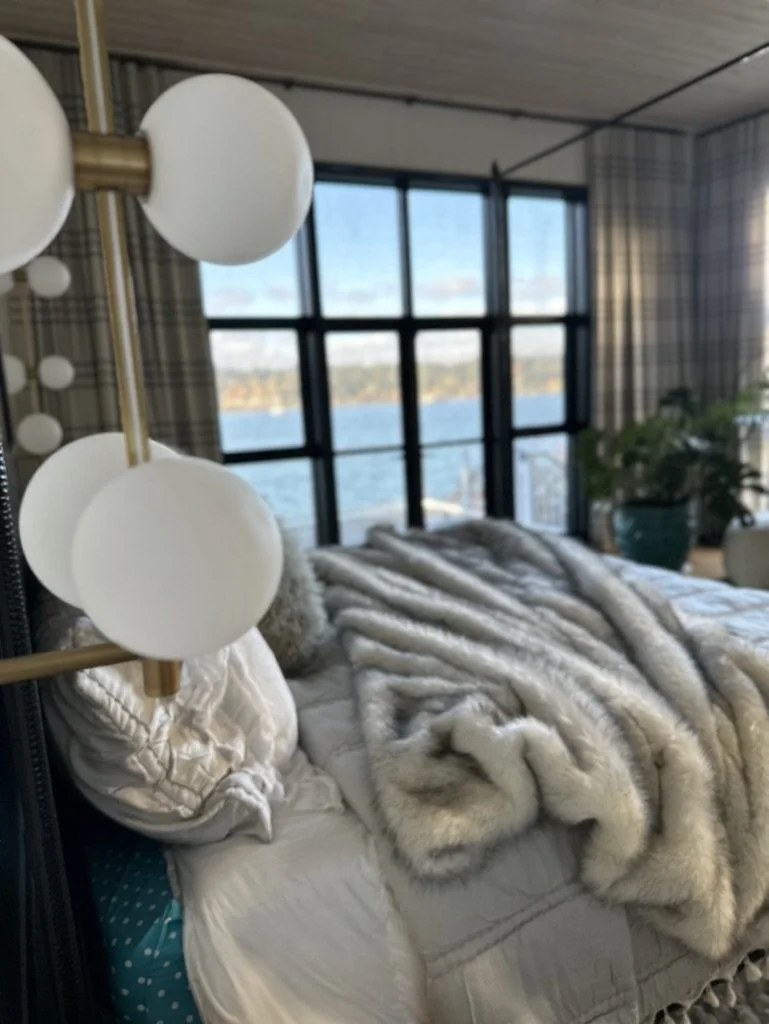 What began as a simple paint consultation for the primary bathroom quickly evolved into a full-scale, whole-house transformation. Every surface was reimagined—from walls to ceilings, floors to furnishings. Wide plank reclaimed flooring grounds the home, while 10-foot metal-and-glass barn doors create dramatic passages between spaces. Enormous glass chandeliers punctuate rooms with lighthearted grandeur, while custom furniture, draperies, rugs, and original artwork infuse personality throughout. Bold, playful wallpapers and layered textures bring energy and visual delight to every corner. Architectural details—including arched doorways, a river rock fireplace, and a soapstone-clad fireplace in the primary suite—add depth and tactile richness. In the powder room, a pink and brown onyx floating vanity serves as a sculptural centerpiece, combining luxury with utility, while in the primary bath, the massive birds-and-flowers wallpaper mural makes us feel Lilliputian by comparison. The design balances modern interventions with material-driven warmth, resulting in a home that is visually captivating, playful, and richly layered. And the cherry on top? A 7-foot-tall giraffe holding an Italian crystal chandelier in its mouth.