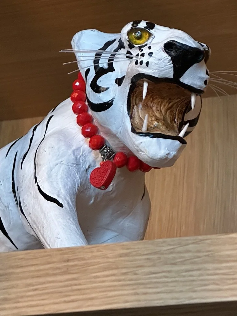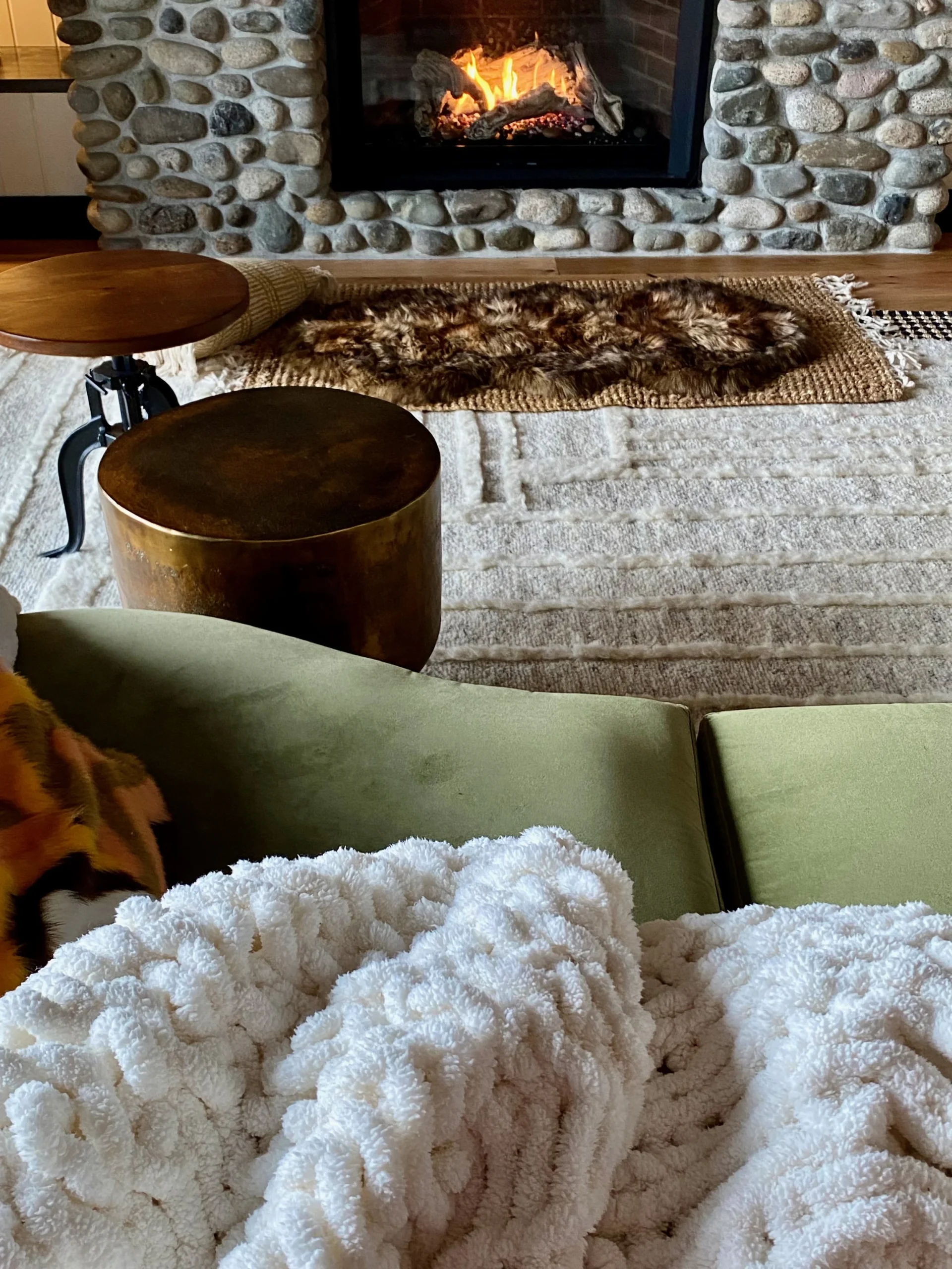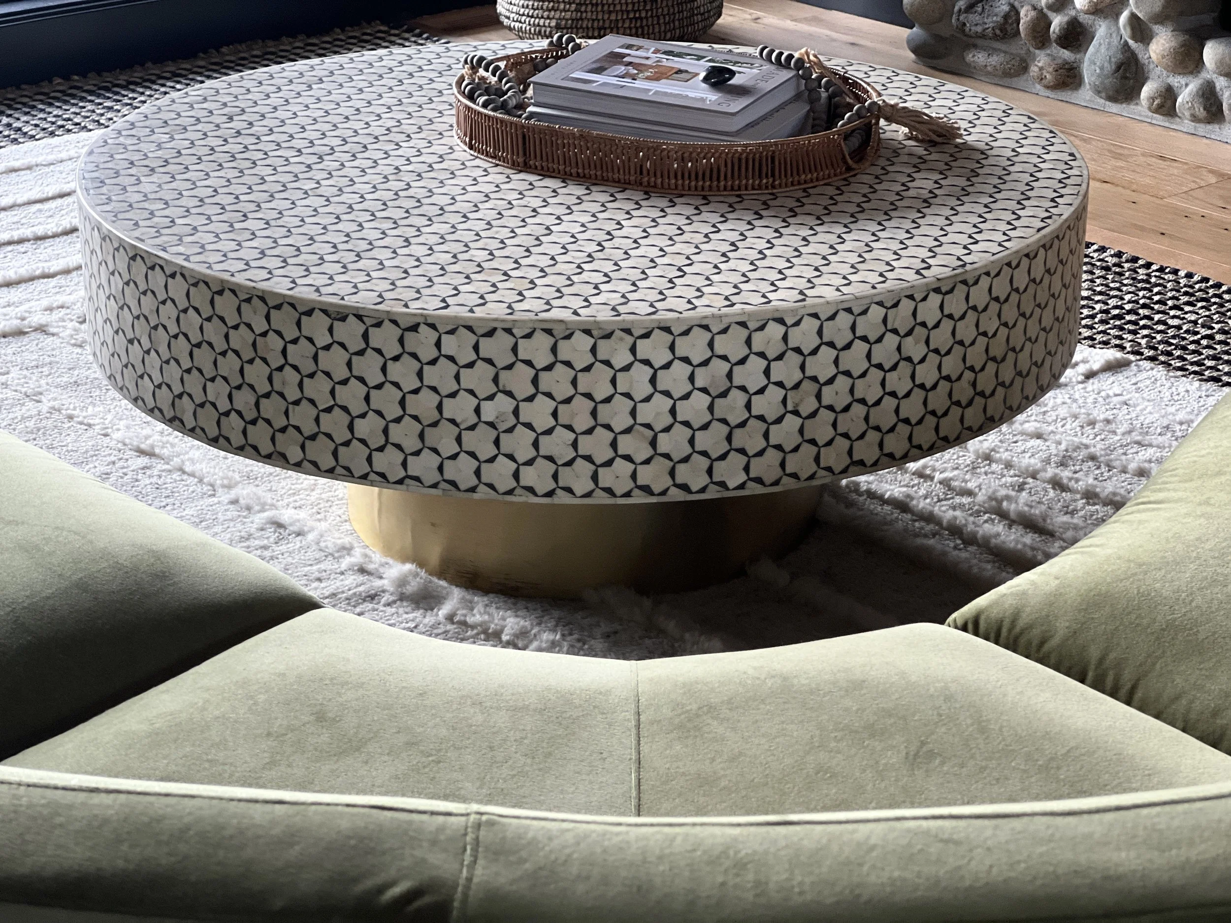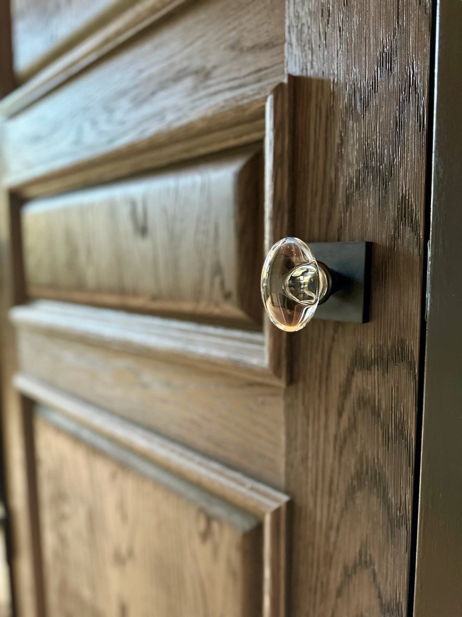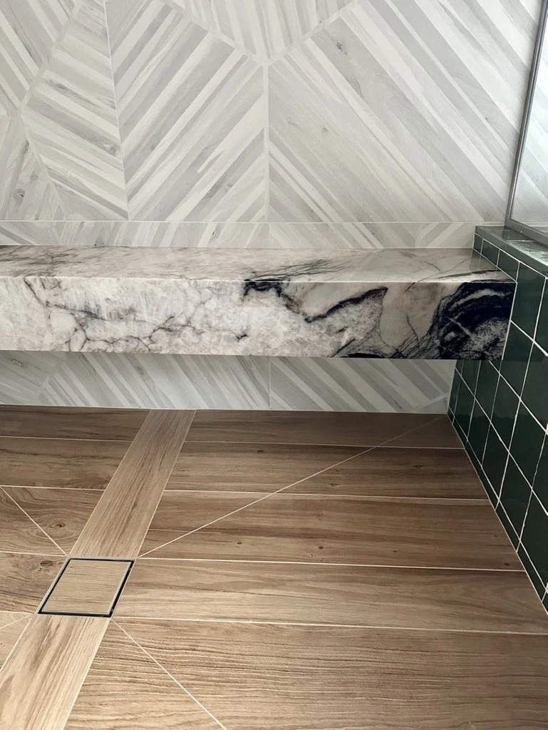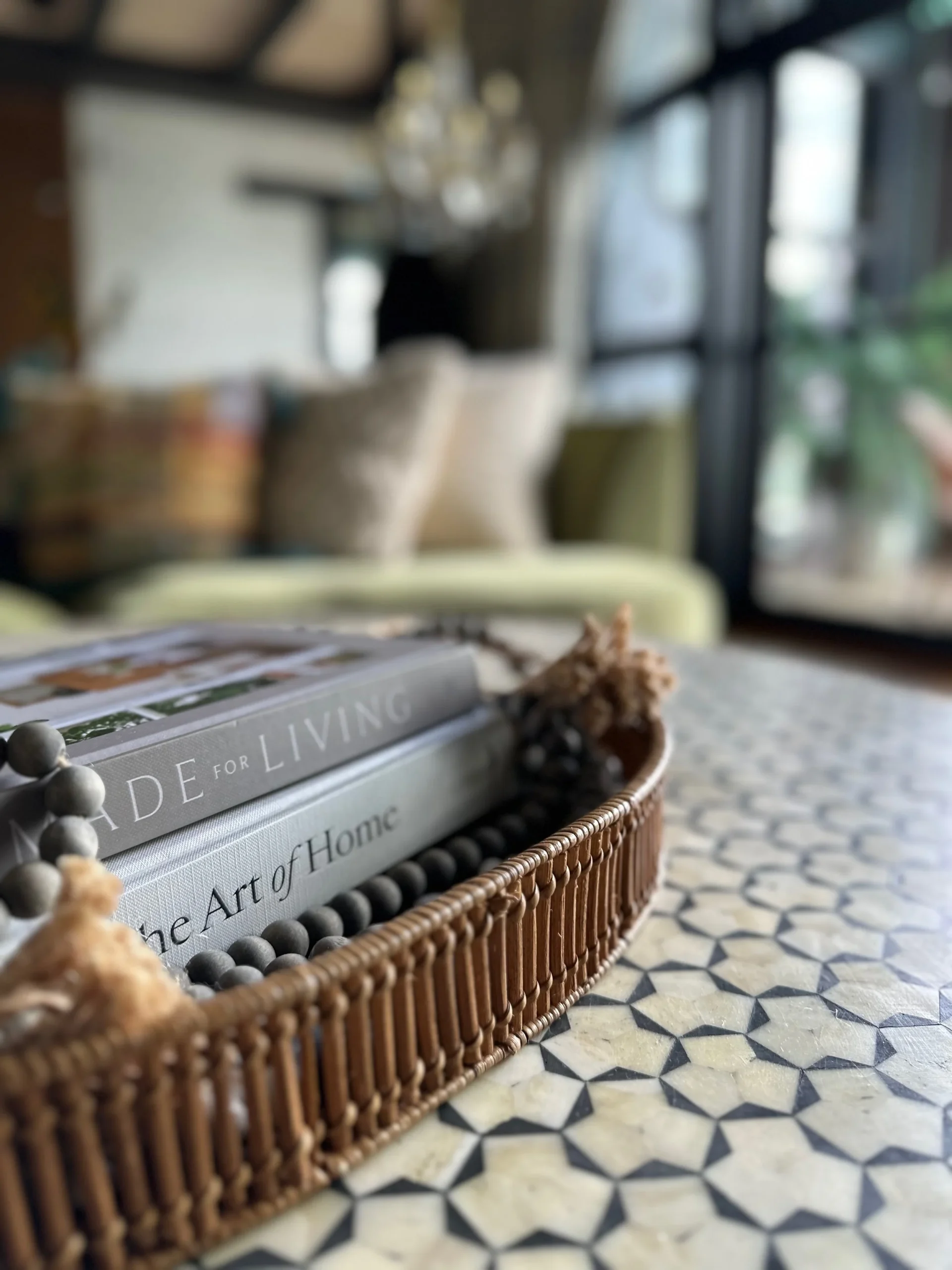 What began as a simple paint consultation for the primary bathroom quickly evolved into a full-scale, whole-house transformation. Every surface was reimagined—from walls to ceilings, floors to furnishings. Wide plank reclaimed flooring grounds the home, while 10-foot metal-and-glass barn doors create dramatic passages between spaces. Enormous glass chandeliers punctuate rooms with lighthearted grandeur, while custom furniture, draperies, rugs, and original artwork infuse personality throughout. Bold, playful wallpapers and layered textures bring energy and visual delight to every corner. Architectural details—including arched doorways, a river rock fireplace, and a soapstone-clad fireplace in the primary suite—add depth and tactile richness. In the powder room, a pink and brown onyx floating vanity serves as a sculptural centerpiece, combining luxury with utility, while in the primary bath, the massive birds-and-flowers wallpaper mural makes us feel Lilliputian by comparison. The design balances modern interventions with material-driven warmth, resulting in a home that is visually captivating, playful, and richly layered. And the cherry on top? A 7-foot-tall giraffe holding an Italian crystal chandelier in its mouth.