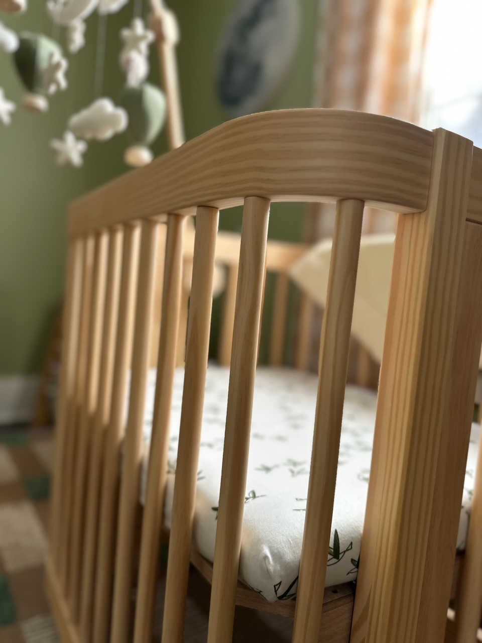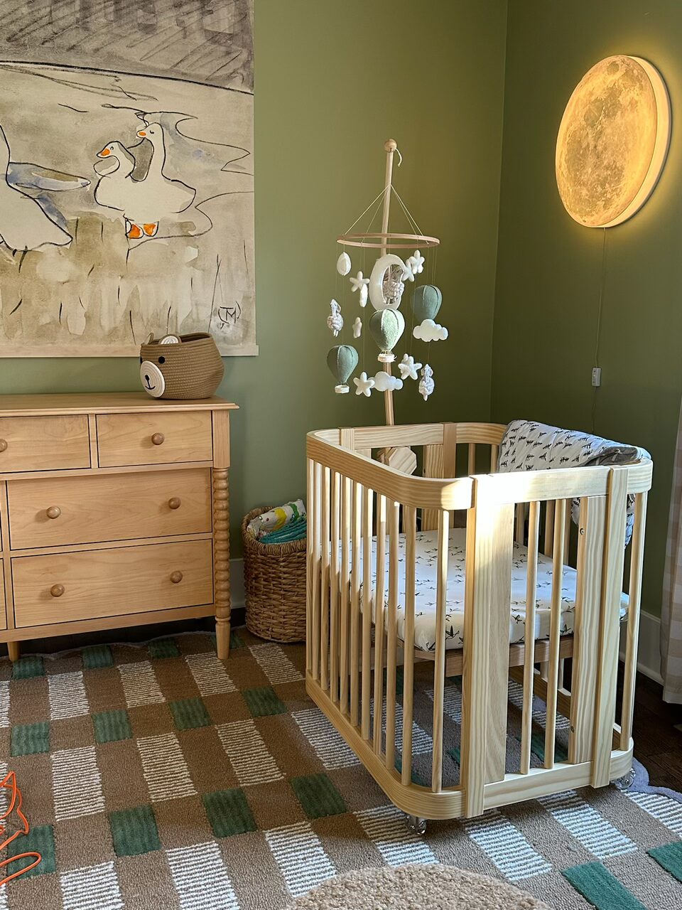 A playful plaid scalloped rug introduces texture, while an oversized teddy-bear of a boucle swivel chair provides a cozy “hug” for both parent and baby. A curvy floor lamp in a glossy pop of orange adds a modern counterpoint, and a glowing moon doubles as nightlight and art, casting a soft, enchanting light. We layered in buffalo-check curtain panels, a spindle-detailed blond-wood dresser/changing table, a wood “root” side table and a curved convertible crib designed to seamlessly evolve into a toddler bed.