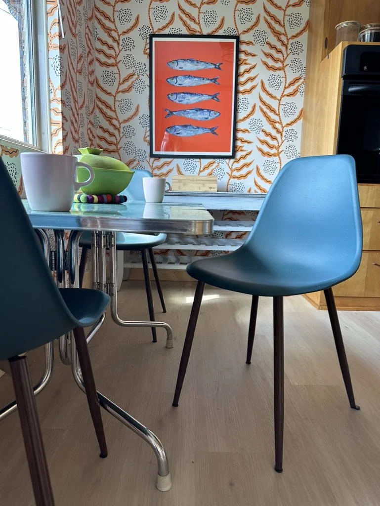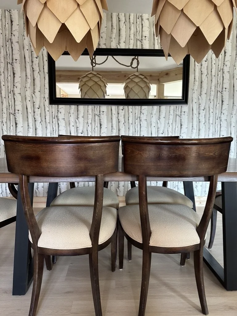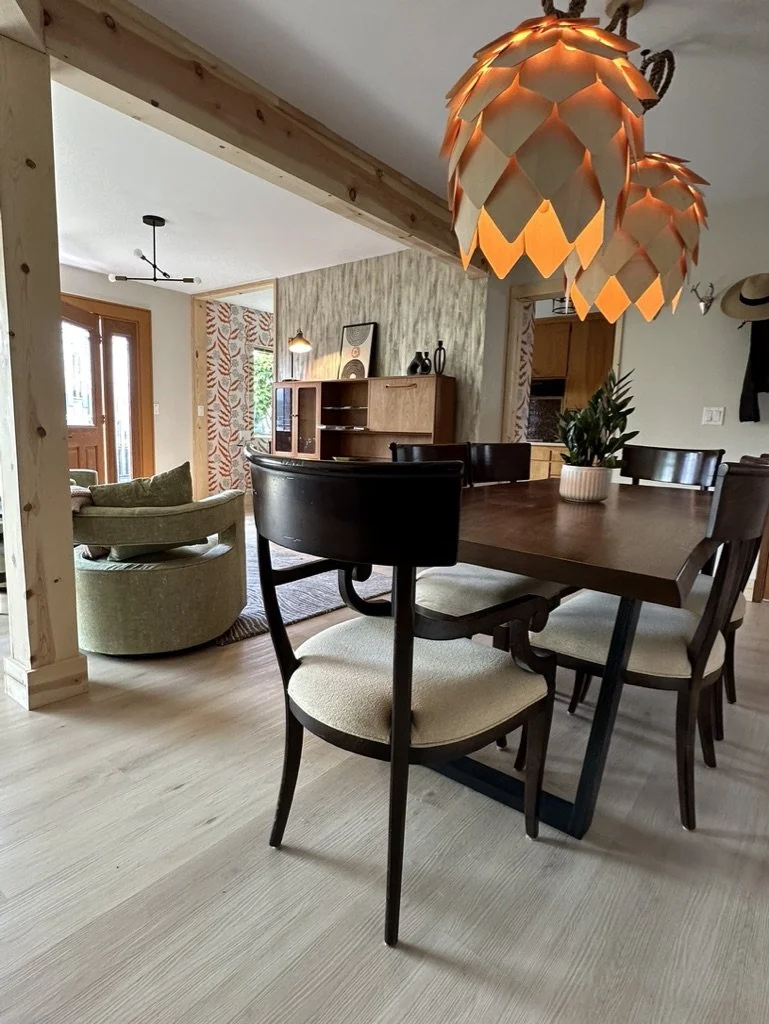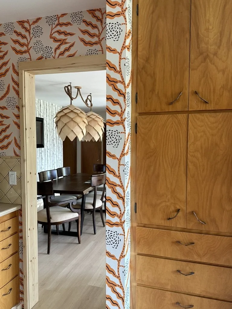 For this Scandinavian–meets–Mid-Century Modern vacation rental, we artfully layered old and new to create maximum appeal for potential guests. We highlighted the home’s mid-century details—like the slab-front wood kitchen cabinets and wall tile—by introducing playful wallcoverings, oversized wood acorn pendants, and an eclectic mix of textural furnishings, rugs, and window treatments. The result is a space that feels thoughtfully curated, visually dynamic, and perfectly balanced between timeless design and contemporary charm.
