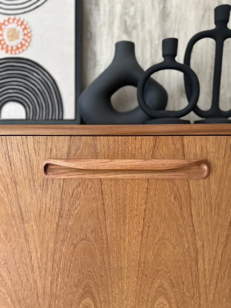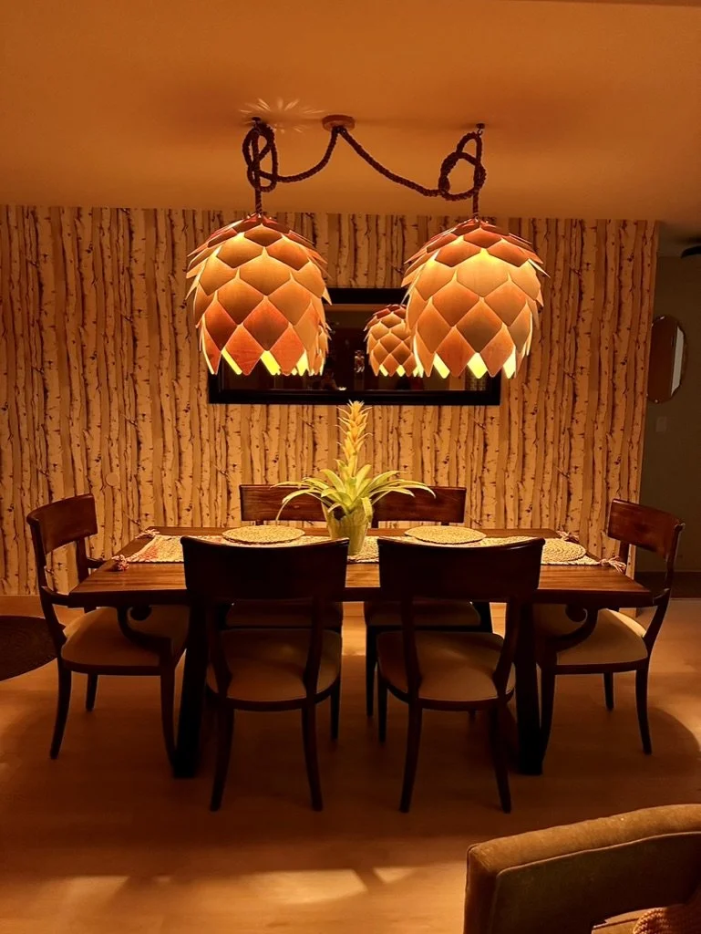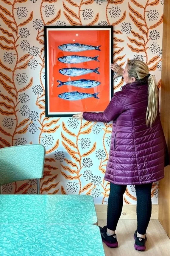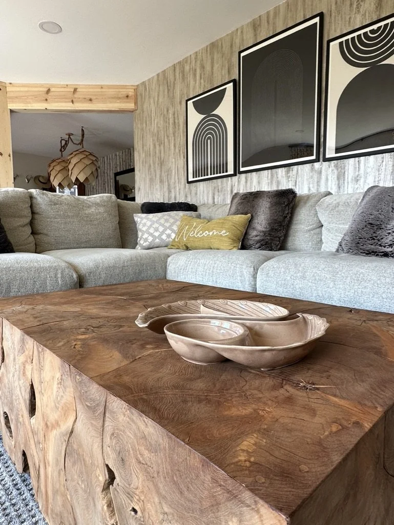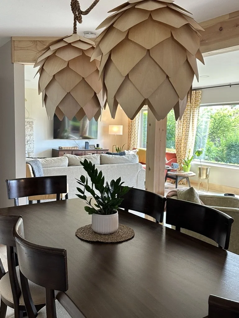 For this Scandinavian–meets–Mid-Century Modern vacation rental, we artfully layered old and new to create maximum appeal for potential guests. We highlighted the home’s mid-century details—like the slab-front wood kitchen cabinets and wall tile—by introducing playful wallcoverings, oversized wood acorn pendants, and an eclectic mix of textural furnishings, rugs, and window treatments. The result is a space that feels thoughtfully curated, visually dynamic, and perfectly balanced between timeless design and contemporary charm.